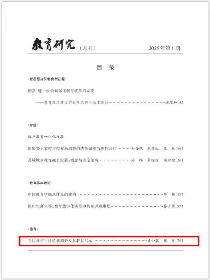 近日,公司青年教师盛小敏作为第一作者及通讯作者在《教育研究》期刊发表了题为《当代青少年价值观调查及其教育启示》的文章,mksport体育为该论文的第一作者单位及通讯单位。