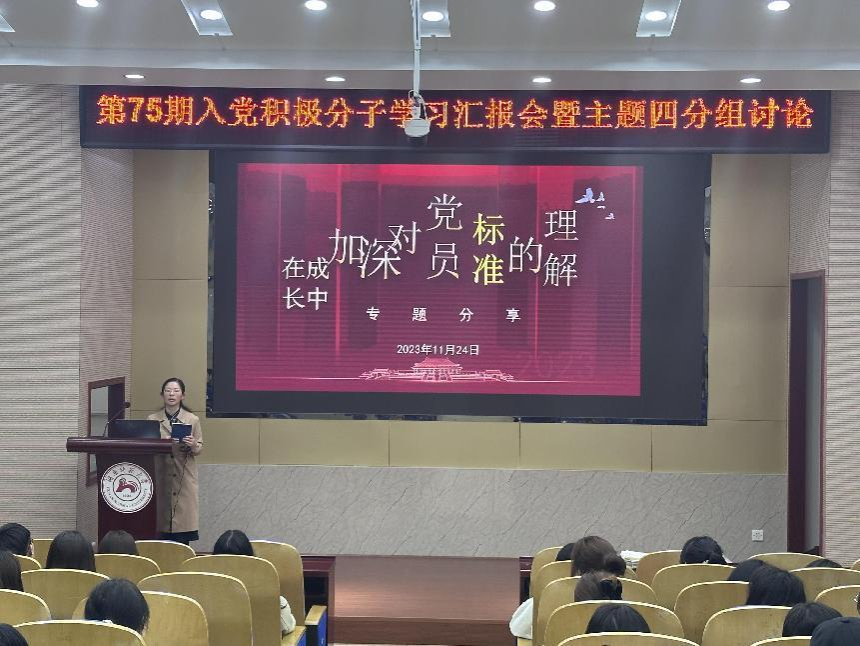 此次活动以小组为单位,每组派出1-2名代表上台进行汇报,汇报内容包括专题四主题——“如何对照标准,创造条件,早日加入中国共产党”、培训感悟两大部分。
