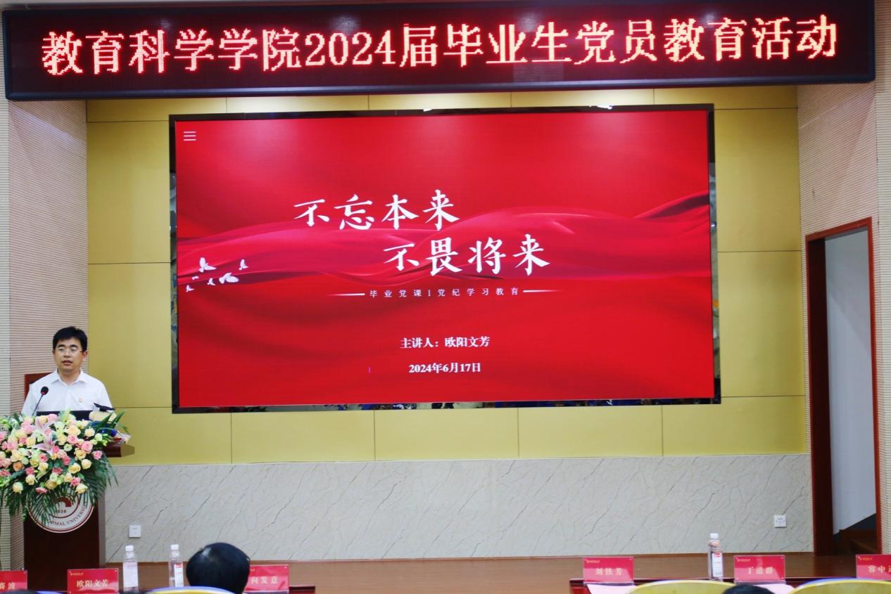 欧阳文芳从“不忘身份”“不忘梦想”“不忘读书”“不畏麻烦”“不畏强权”“不畏困难”等六个方面,为毕业生党员讲授了《不忘本来 不畏将来》的主题党课。他强调广大党员要牢记自己的第一身份,明确身上的“八项义务”“六大纪律”;要将个人的梦想融入国家、民族的梦想;要树立终身学习理念,既多读有字之书,也多读无字之书。鼓励毕业生党员要不畏麻烦,不做“差不多先生”,坚守原则,坚守良知,坚守本心,在逆境中也要保持乐观豁达的心态。