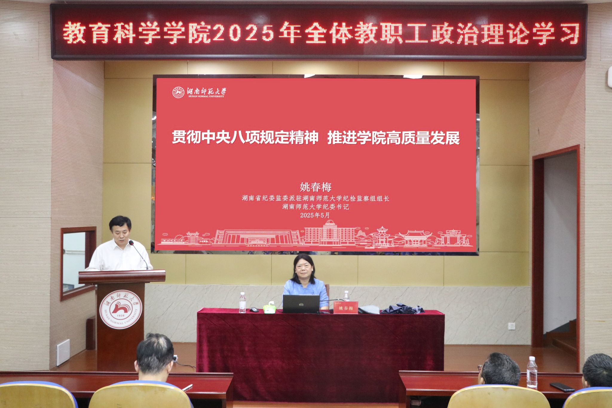 (通讯员 米峻甲 向虹予)5月8日下午,教育科学公司在101学术报告厅举行深入贯彻中央八项规定精神学习教育专题辅导报告会暨2025年全体教职工政治理论学习会。省纪委监委派驻mksport体育纪检监察组组长、校纪委书记姚春梅教授应邀做专题辅导报告,公司党委书记向发意主持会议。