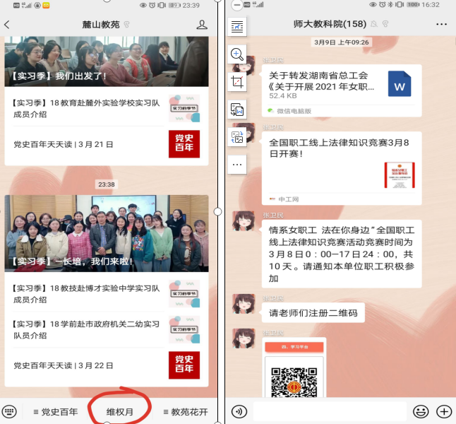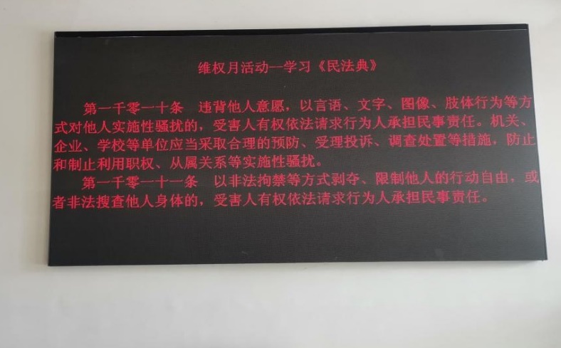 一、面向广大职工开展普法宣传。以工会小组为单位,开展《民法典》、女职工权益保护及性别平等相关法律法规知识宣传;在微信群、微信公众号、公司电子屏等平台,积极做好相关活动的宣传普及。