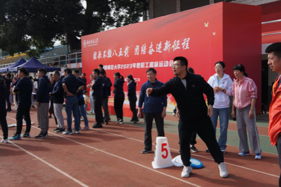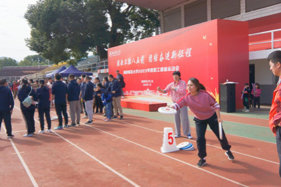 第四个比赛环节是“趣味飞盘”,12名队员两两搭配,每人3个飞盘,接住队友传来的飞盘只是迈出了一小步,接到飞盘后投向九宫格,能穿过某个数字宫格才能得分。学前系教师彭荣投出去的前2个飞盘都稳定地飞到了最大分数“9”的右侧柱子上,她在投掷最后一个飞盘前巧妙地往左侧跨了一小步,轻松将9分收入囊中!队员们“有勇有谋”地夺得了单项第十名的成绩。