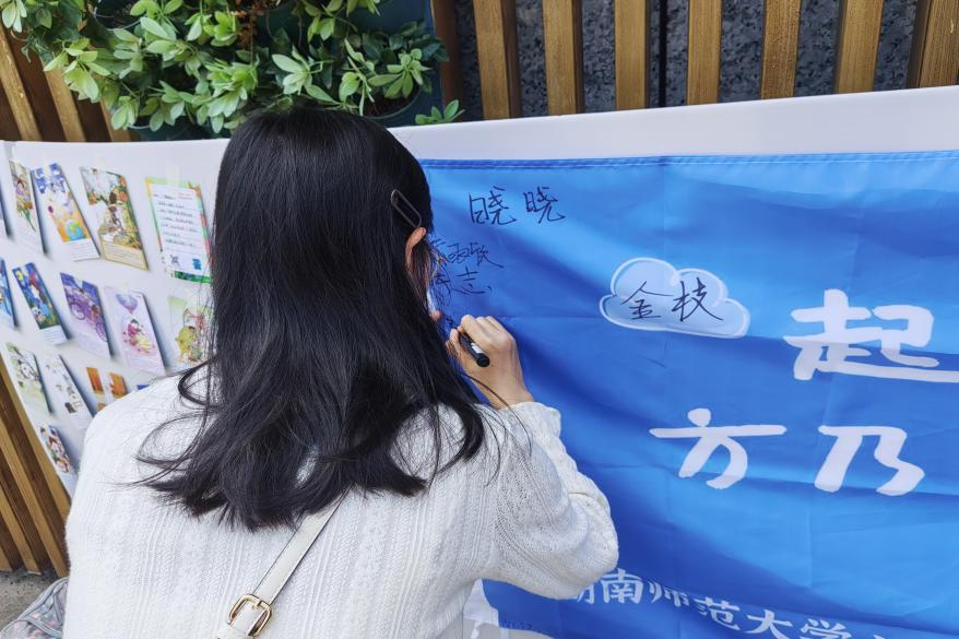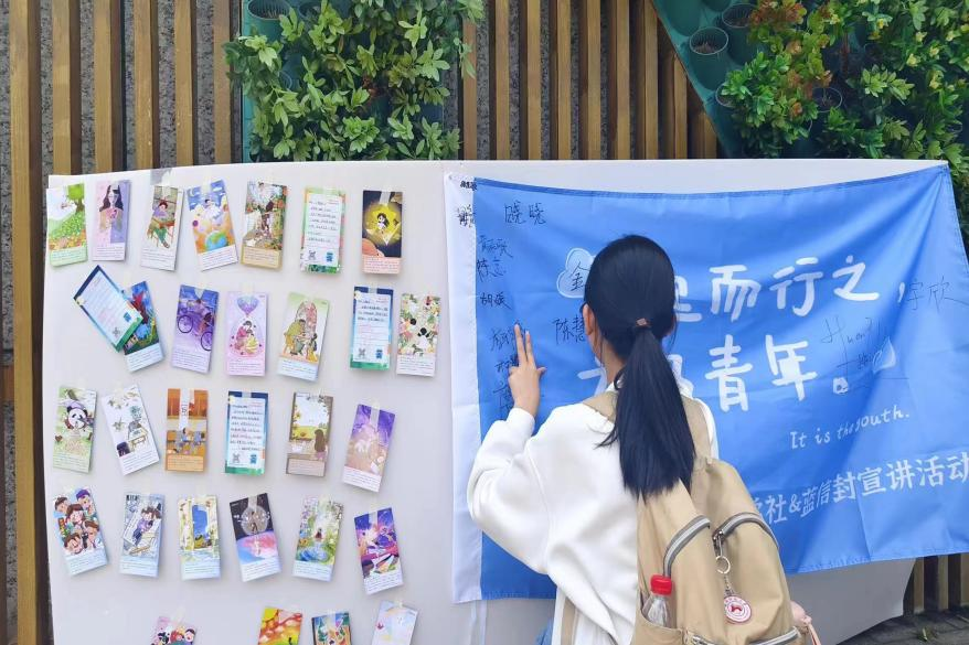 在活动现场,志愿者们向同学们详细介绍了通信大使的职责,不少同学在了解之后扫码关注了“蓝信封邮筒”公众号,并在志愿者们的指引下通过了理论考试,成为预备通信大使。同学们还积极参与了各宣传点位的活动,在签名旗上留下自己的名字,在活动展板上写下近期的烦恼,通过公众号发送“1—100”任一数字获得一张来自乡村儿童的解忧卡。同时为了扩大此次活动的宣传力和影响力,将解忧卡和宣传海报转发至社交平台的参与者均可以获得一份小礼品。