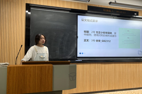 李凌秋将此次会议内容分为三个板块,分别为:公文格式要求、word基本操作、excel基本操作。她采用多种方法详细地展示了办公软件的基本操作,并根据同学们的接纳情况组织进行实操练习,鼓励同学们大胆提出问题,总结了解决问题的措施。她强调,同学们应当熟练掌握办公软件的基本操作,灵活使用办公技巧,对于办公技能学习保持积极认真的态度,勤于反思总结。随后她针对培训的内容开展了相应的考核练习,并根据同学们的掌握情况提出了发展建议。