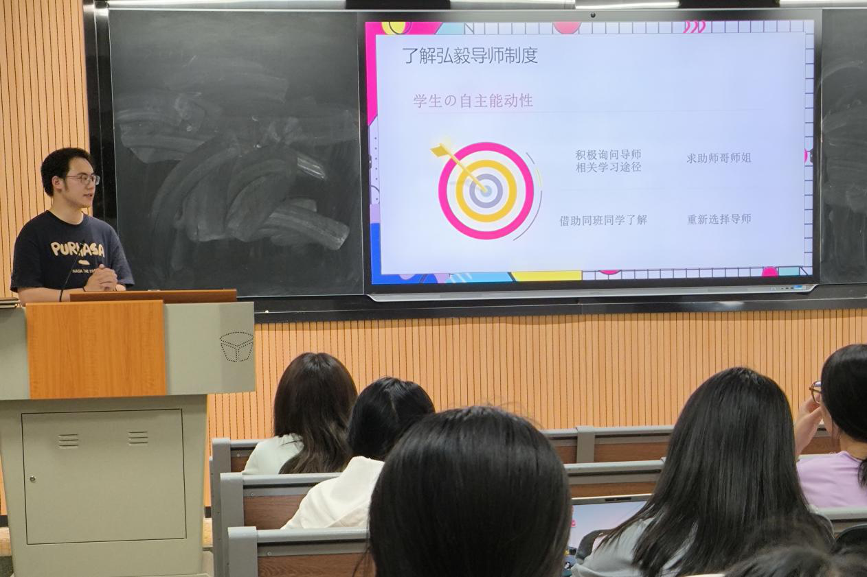 谢明以“如何借助院科研平台助力自我成长”为题,从了解“弘毅导师”制度、充分利用“弘毅导师”制度、“把握平台机会过程中需要注意的问题”这三个方面展开。谢明通过对“弘毅导师”相关文件的研读并结合自身经验向同学们阐明“弘毅导师”制度对大家的重要意义。同时,结合自己参加“挑战杯”全国老员工课外学术科技作品竞赛“揭榜挂帅”专项的作品,向同学们介绍了“揭榜挂帅”专项的流程、形式等相关信息,强调了项目作品选题的重要性。他认为,要充分利用“弘毅导师”制度,将本科阶段学到的知识运用到科研当中,不断总结科研经验,提升科研能力。