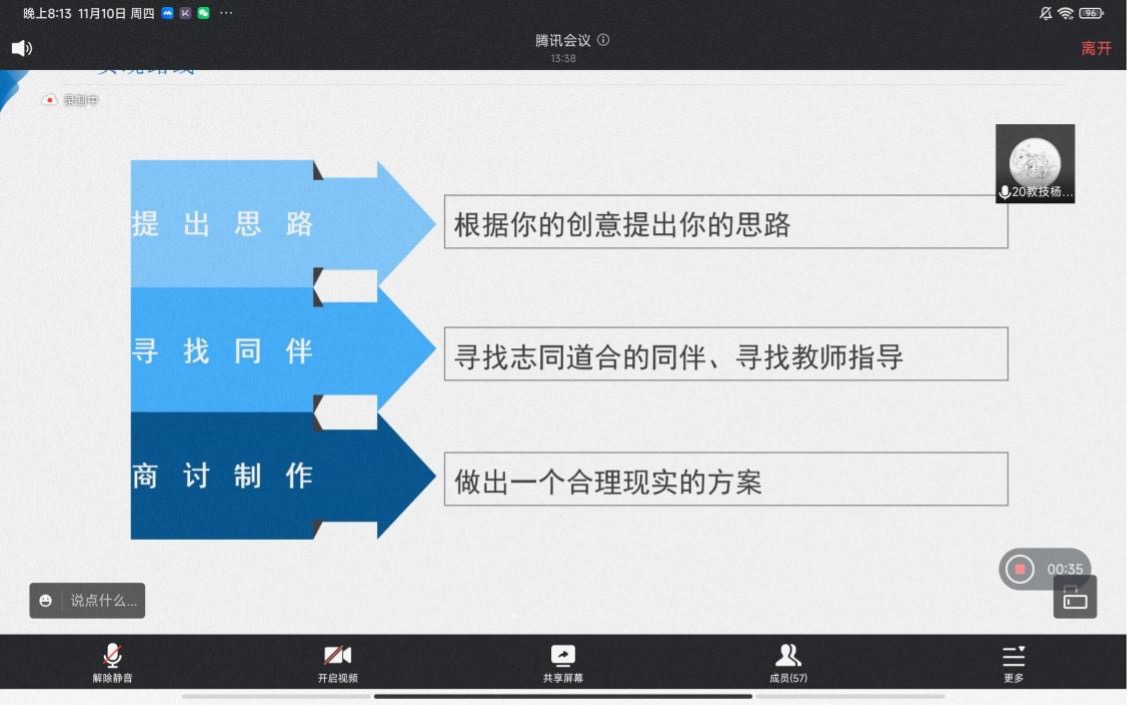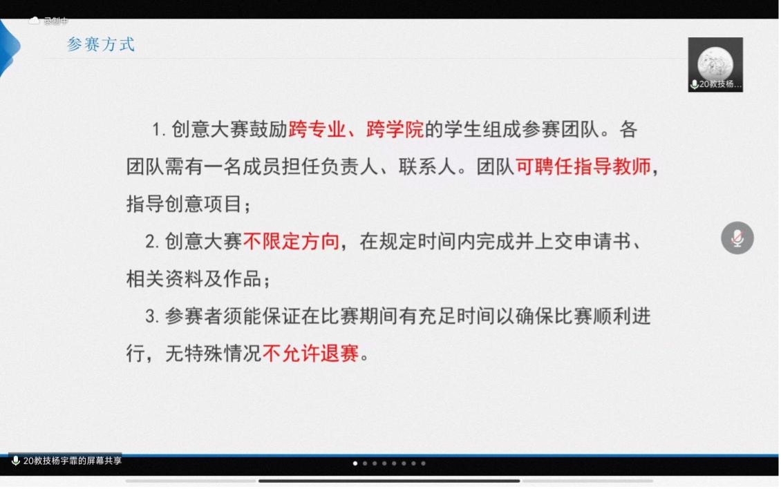 (通讯员 黄希 宗志敏 张泽宇)11月10日晚上,MK体育第十二届“金点子”老员工创意大赛宣讲会于腾讯会议平台举行。2020级教育技术班杨宇霏担任主讲人。