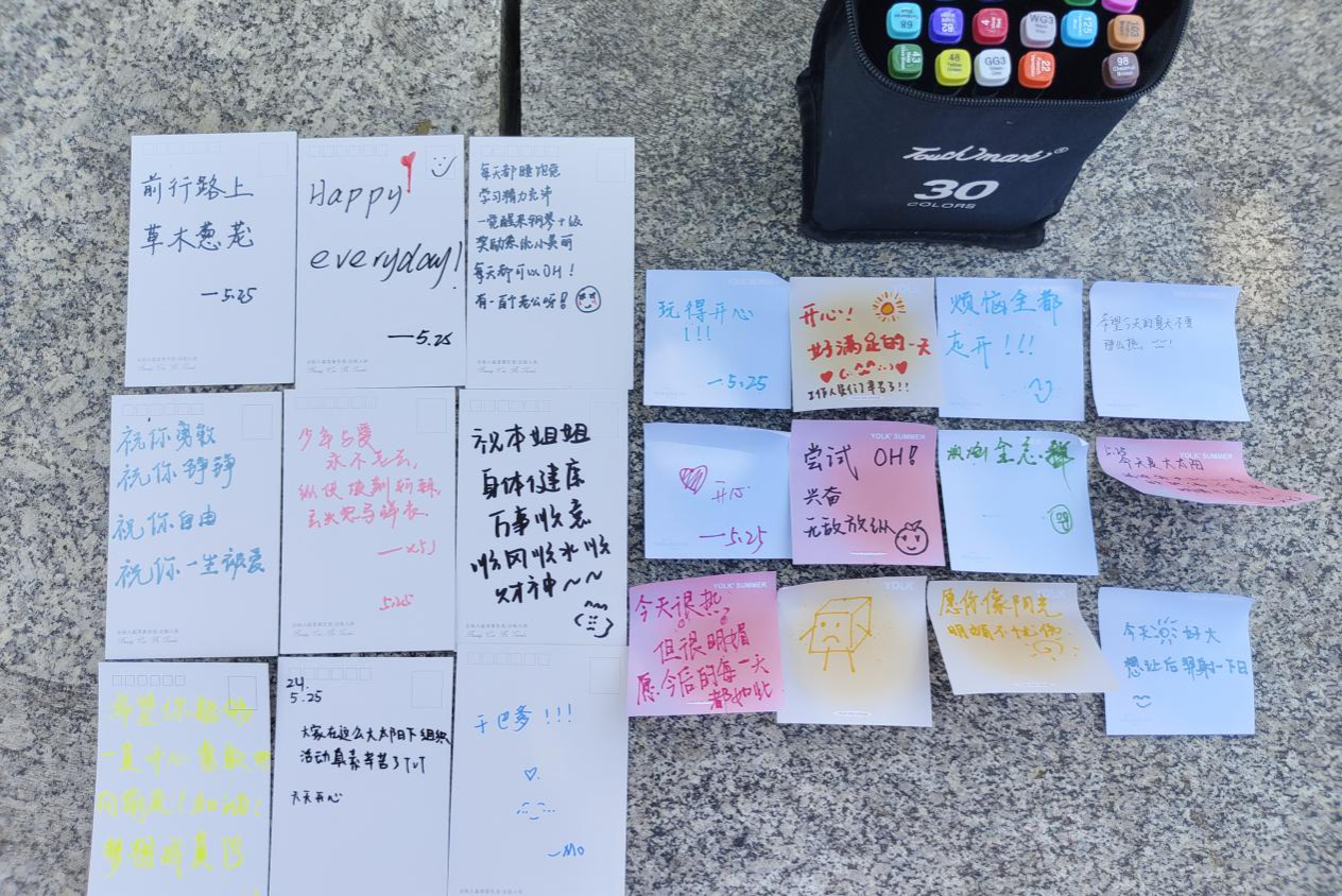 参与同学到达活动地点后在工作人员引导下完成四项环节任务。在“多巴胺签到”环节,参与者在动物便利贴上写下此刻心情。随后进入第二环节,同学们可以与他人交换心情便利贴,并在明信片上为交换的同学送上鼓励的话语。在第三环节“情绪解压站”中,同学们可以通过捏破泡泡纸的方式释放情绪,缓解压力。最后进入“套环ABC”环节,工作人员在指定区域内放置手持小风扇、变脸玩偶、小木鱼等多种礼品,每位参与者有三次套圈的机会,套中即可获得目标礼品,三次均未套中的同学也可获得社团准备的精美书签一份。