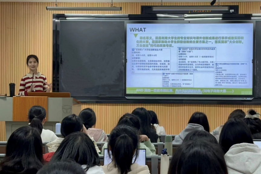 王艺橙以“探索未知的森林”为题,从“什么是创新创业比赛”、“为什么要参加创新创业比赛”和“怎样选择合适的项目”三个方面分别展开论述。同时向同学们详细阐述了项目计划书的撰写方法,以介绍项目计划书的结构切入,结合自己的参赛作品进行展示,强调了项目作品需要创新性及其特色。