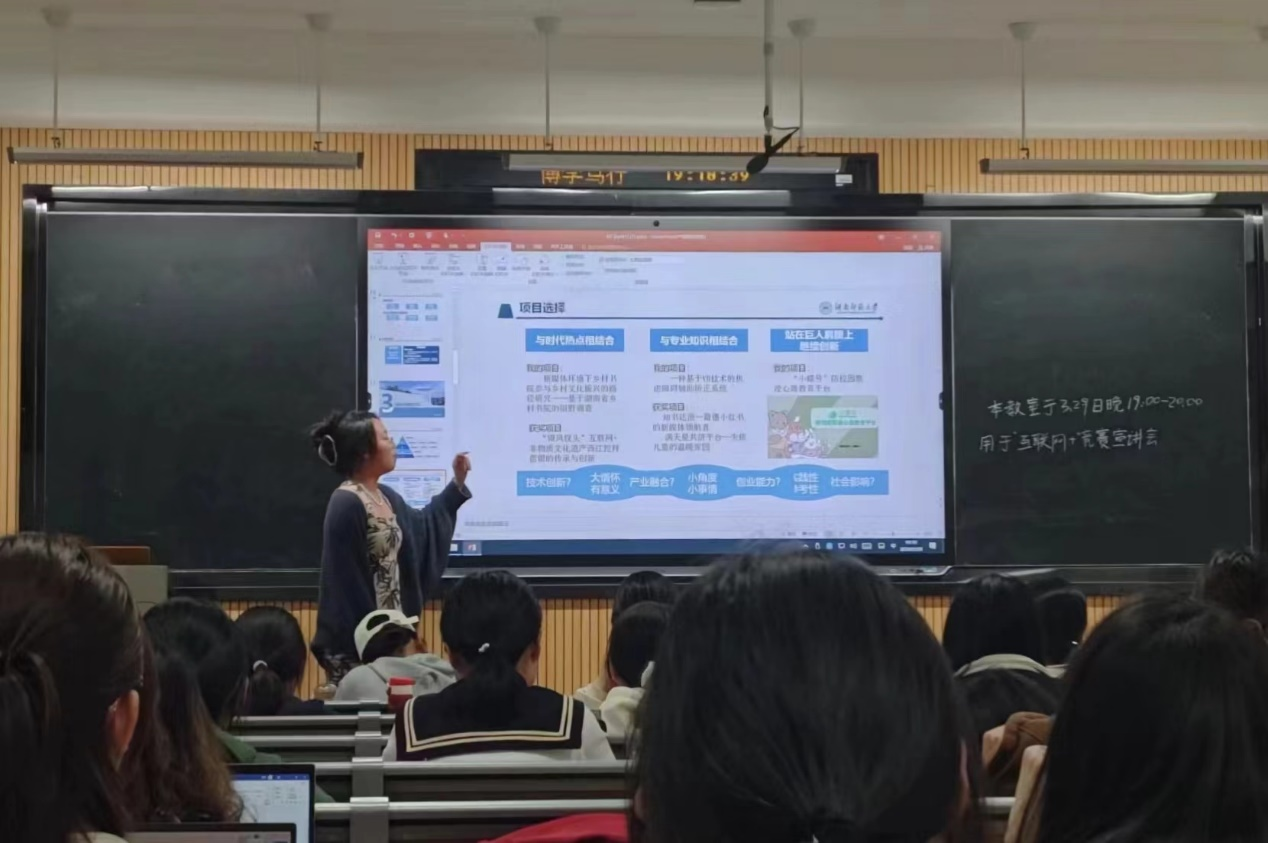 王思斯以《 从0-1突破“互联网+”大赛 》为题,从“互联网+”基本介绍、具体参赛流程、项目经验分享这三个方面入手,介绍了中国国际大学创新大赛不同赛道的参赛要求及队员构成并画出了比赛时间进程表。在项目经验分享方面,她列出了比赛进程金字塔,自下而上分别为明确动机、项目选择、完成组队、参加比赛、继续完善,着重强调参加创新创业比赛要根据动机来要求自己,同时指出创意来源于生活,要与时代热点相结合、与专业知识相结合,可以“站在巨人的肩膀上”继续创新。在总结环节中,她鼓励同学们参加比赛,尽管一次参加并未取得成果也不要放弃,要持续完善项目,争取在下一次比赛中取得进步。