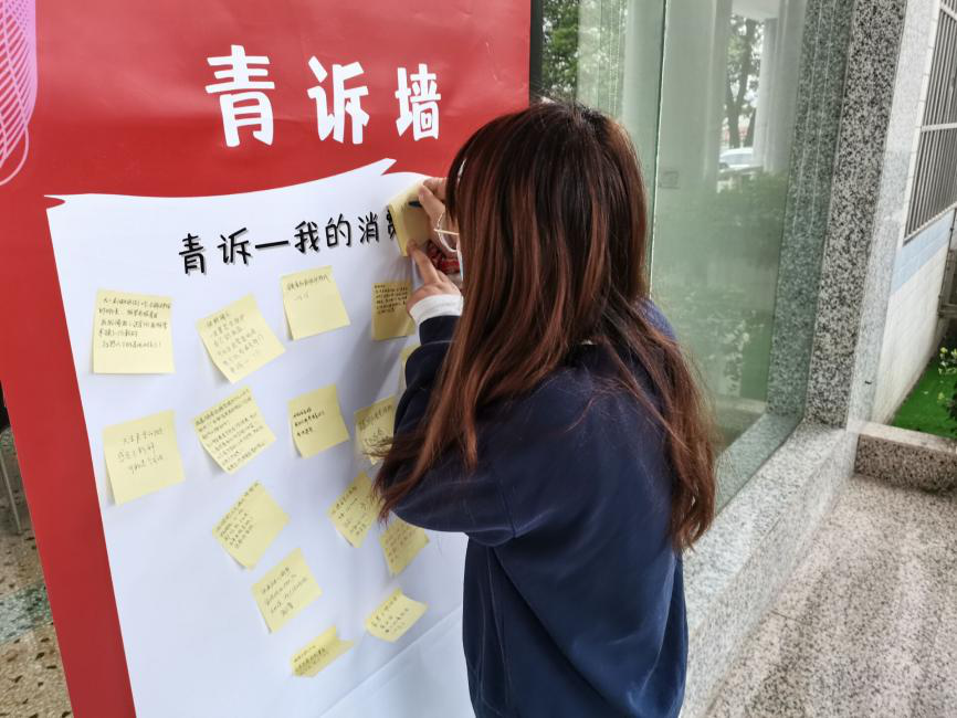 活动伊始,负责人通过线上向同学们发通知的方式,呼吁大家积极参与。该活动采取在便利贴上写下自己的消费经历并贴在“青诉墙”上的形式,然后展示在教科院一楼大厅。在活动过程中,同学们积极粘贴自己的消费维权故事和维权建议,参与的同学都可以领取到一份小礼品。活动最后,同学之间相互了解消费经历,学到了如何保护自己的消费权益。