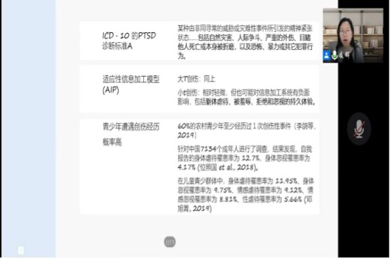 凌辉为同学们介绍闪动疗法,从创伤及其相关心理问题、闪动疗法相关问题、EMDR与FT的关系、闪动疗法的优势、闪动疗法团体工作程序五方面来讲述了闪动疗法在创伤相关心理问题的应用。她指出,创伤经历青年相关的认知,情绪及行为特点。最后,凌辉邀请几名同学体验了闪动疗法,加深同学们对闪动疗法的理解,普及相关心理学知识,帮助同学们应用闪动疗法解决实际生活中的心理问题。