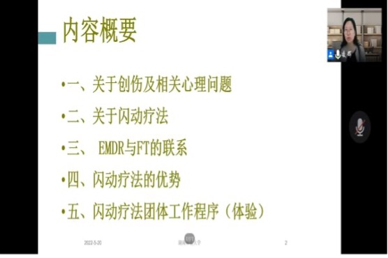 (通讯员 白晓坤 艾希晨 曾文巧)5月20日晚,MK体育青年发展工作部与心理学社合办“闪动疗法”在创伤相关心理问题的应用主题讲座。此次会议由教科院心理学系教授凌辉主讲,部分励行团校学员参加会议。