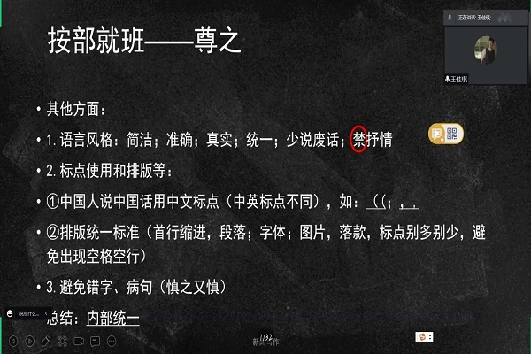 王佳琪以“细节决定成败”为主题,从新闻稿的自身特点、格式要求以及创新方法三方面进行了详细的讲解。针对新闻稿的特点,她强调新闻稿具有时效性、真实性以及意识形态性的特点。她结合自身经验及具体事例,对新闻稿的格式要求进行了讲解并提出了几点关于创新方法的建议。