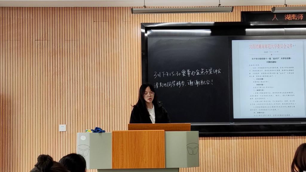 (通讯员 谢蕙如 杨湘荣)10月23日下午,教科院团委青创部于田家炳教育书院301教室开展金点子创业大赛宣讲会。教科院20级员工杨宇霏担任活动主讲人,院团委负责人谭梦,21级辅导员庞瑞宇出席讲座,教科院2021级部分新生参与此次讲座。讲座由青创部21级干事黄希主持。