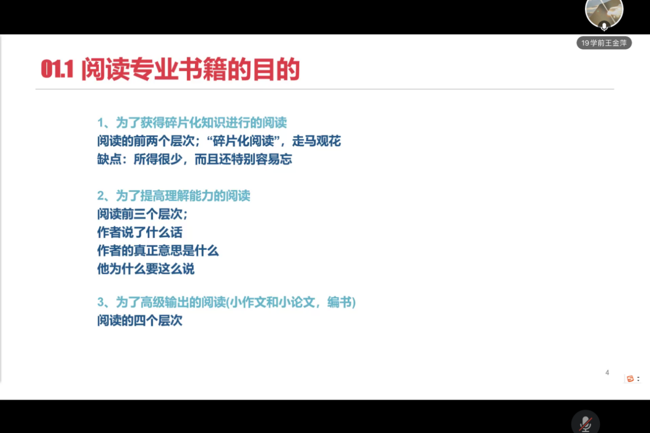 (通讯员 谢如 卢勇)4月2日晚,教科院团委青创部于线上腾讯会议开展本学年第五期精勤讲堂。19学前王金萍担任活动主讲人,教科院部分本科生参与此次讲座。讲座由青创部干事罗紫怡主持。