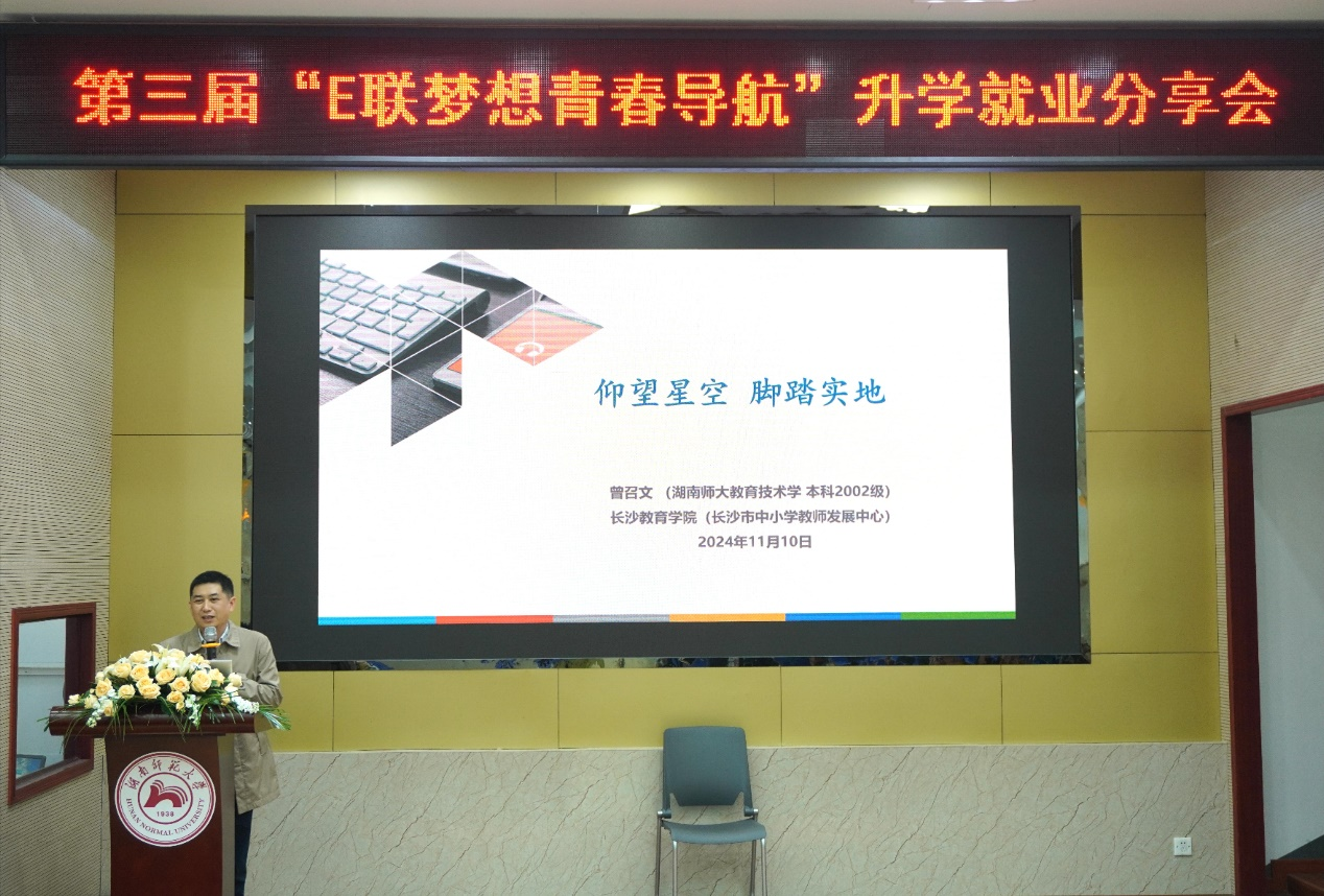 曾召文是长沙教育公司信息技术学科负责人,以“仰望星空,脚踏实地”为主题分享了他在中小学教师培训、信息科技教育研究方面的经验,并鼓励同学们将所学知识应用于实践。