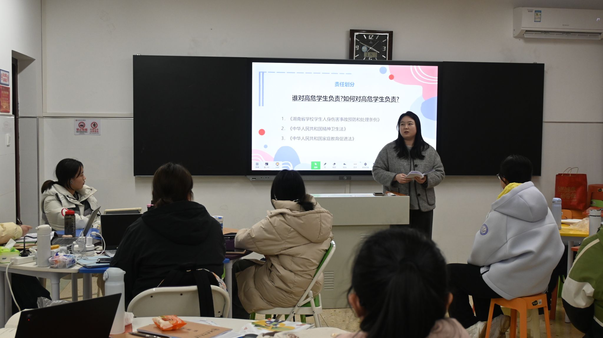 在随后的法律法规专题学习中,刘颖系统解读《湖南省公司员工人身伤害事故预防和处理条例》《中华人民共和国精神卫生法》等法规文件,重点剖析心理健康教师的责任边界与高危员工处置流程。通过实际案例分享,明确“早发现、早评估、早干预”的工作原则,强调心理教师需建立专业转介意识,完善家校医协同机制。实习队队长何锦京组织队员们就“如何平衡保密原则与危机干预”“转介过程中的法律注意事项”等问题展开深入讨论,强化了依法从教的责任意识。实习队员曾盈表示:“此次活动既帮助我们优化了教学设计能力,更树牢了校园心理安全的法律红线意识。特别是在高危员工处置方面,我们深刻认识到专业能力与法律素养缺一不可。”