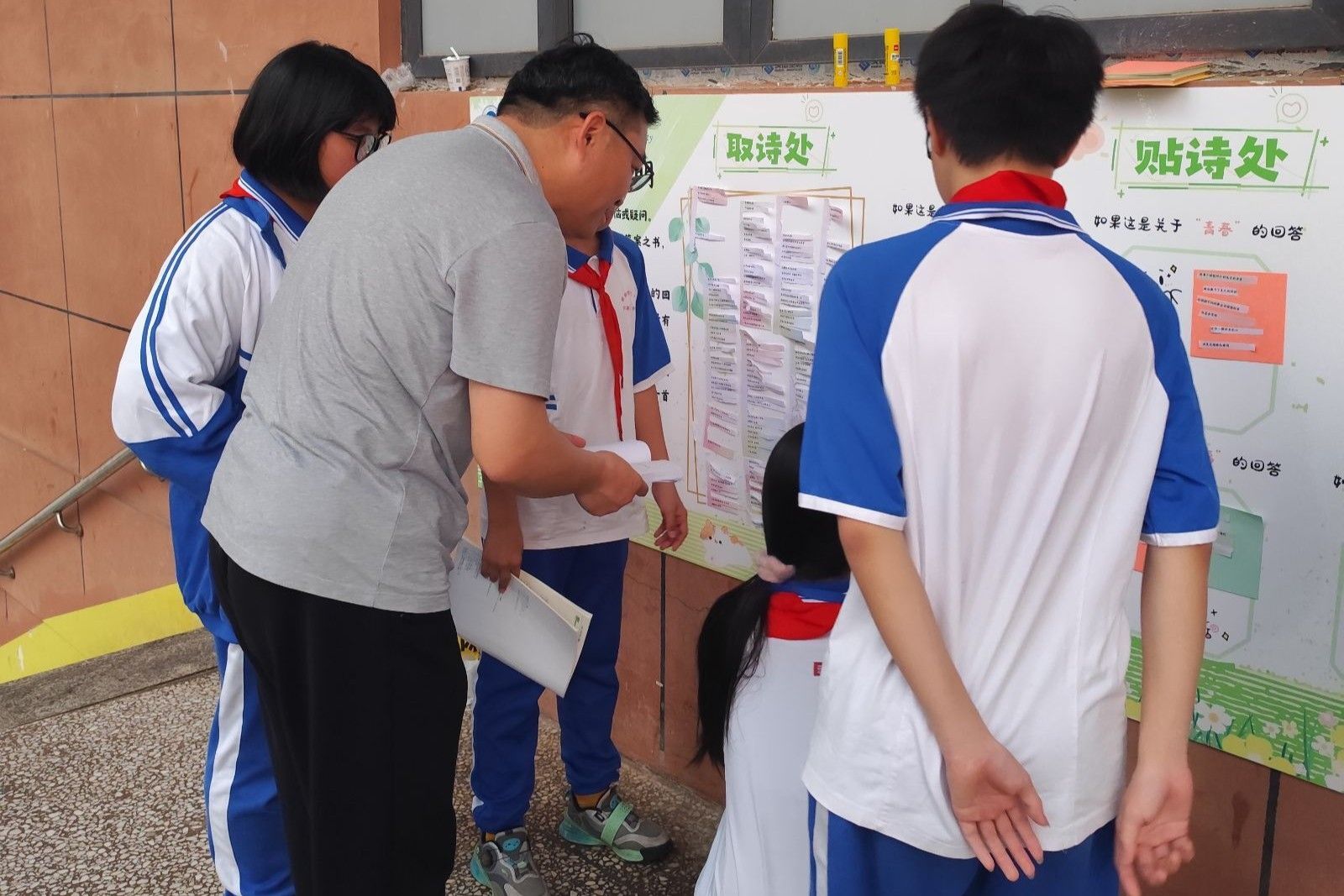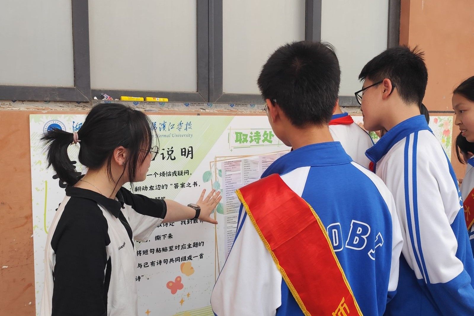 活动现场以展板的形式划分了“规则说明”、“答案之书”、“取诗处”和“贴诗处”四大板块。现场还设置了“心灵解码员”岗位,由实习队员舒梓玥和员工志愿者为参与者解析诗歌中的情绪密码。舒梓玥表示,“心灵解码员”的任务不是评判诗歌的好坏,而是引导参与者发现文字背后的情感。员工志愿者提到,很多同学的问题其实有共通性,和同学一起讨论如何用积极的心态面对变化,也让志愿者反思自己的成长。