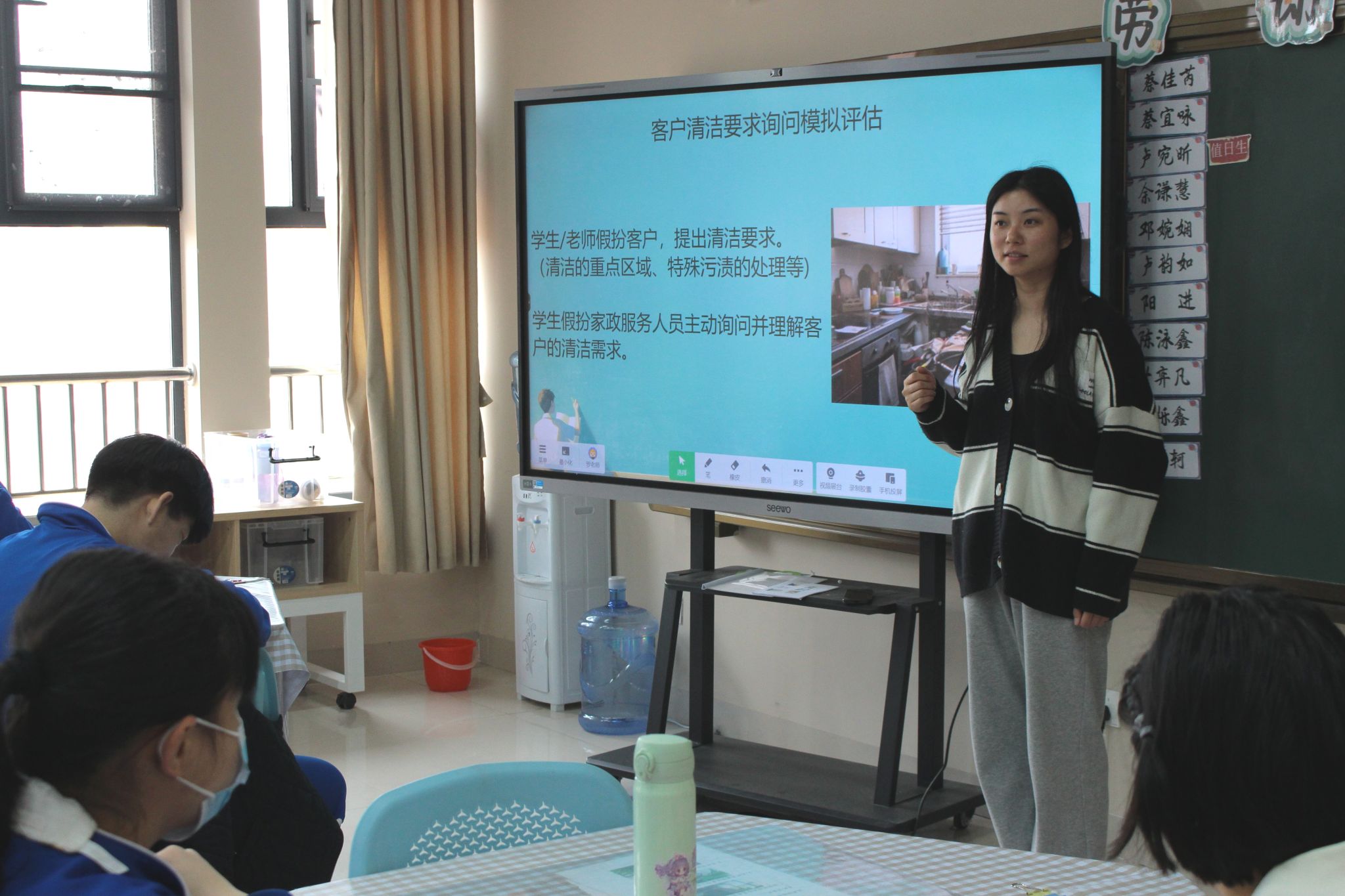 此次课堂分为启动、建构、巩固与总结四个环节。罗曌玺先通过提问引出了“家政服务员”的职业主题。建构环节中,罗曌玺播放视频,引导员工建立职业认知。她还结合了图片讲解了家政服务员的工作内容,并重点演示抹布、玻璃擦、凹槽缝隙刷等清洁工具的使用方法。赵云艺则负责指导员工分组进行实操练习。巩固环节中,同学们参与了知识抢答、叠毛巾大比拼等趣味游戏,强化在课堂上学到的内容。游戏过后,罗曌玺再次对课堂重点知识进行回顾与总结。