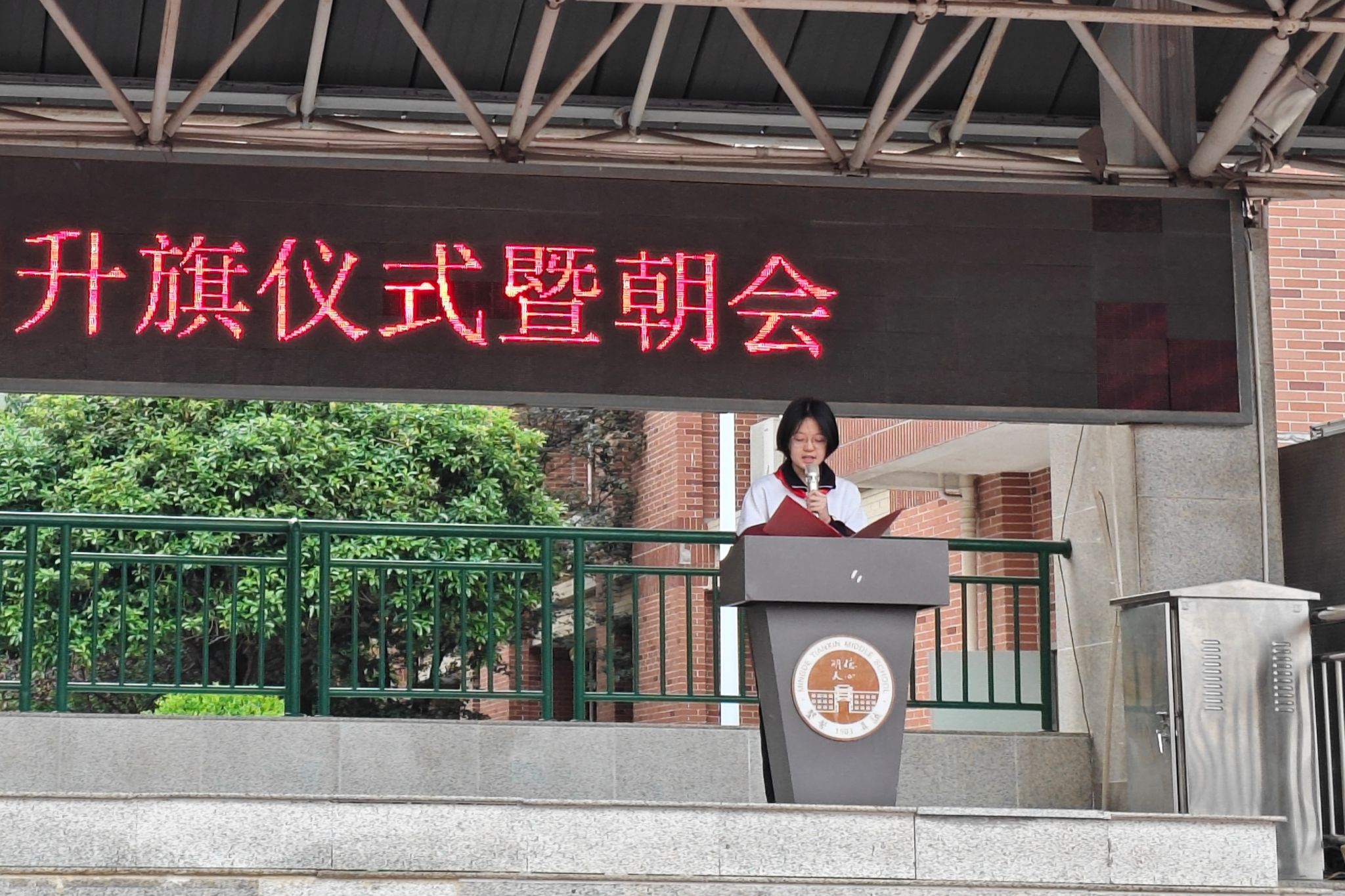 此次朝会的主题为“说好普通话,共抒中华情”,由2401班员工代表杨浏壹担任主讲人,她以“千生归一处,官话同音”为题在国旗下讲话,从社会生活的各个角度阐述普通话的重要性,呼吁同学们规范用语,积极推广普通话。朝会最后,明德天心中学教育处副主任贾阳兵对朝会纪律作出要求并进行上星期德育常规总结,提醒全体员工注意校外交通安全。