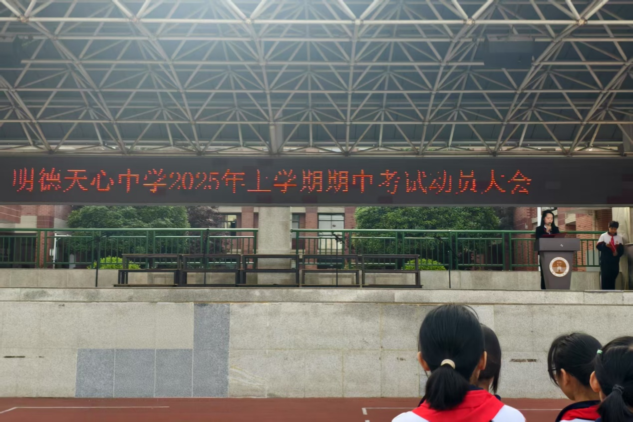 大会第一项,升旗仪式。明德天心中学员工护旗手出国旗,升国旗、校旗,全体同学肃立敬礼,齐唱国歌、校歌。在国旗下讲话环节,明德天心中学员工代表2408班刘子墨同学进行“智慧启航,青春逐梦”主题演讲,她呼吁同学们在青春的赛道上奋力奔跑,用智慧创造未来,明德天心中学副董事长冉银莎进行2025年上学期期中考试动员大会,她从目标设定、知识系统构建、知识漏洞补缺和道德品行等方面对全体同学提出建议和要求。