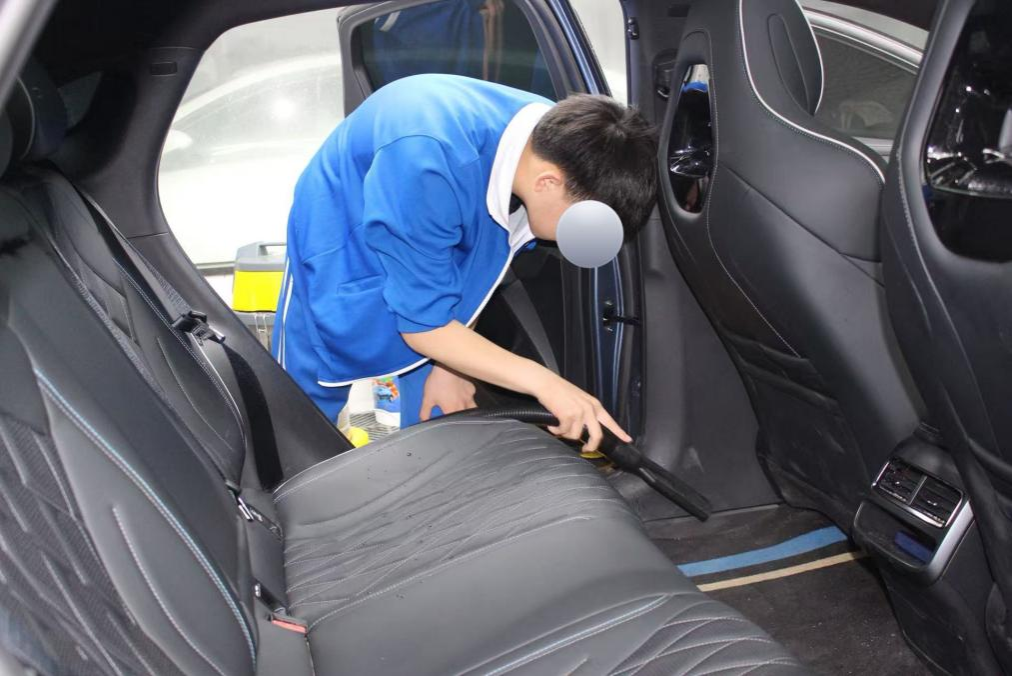 此次授课主要分为理论教学和实践操作两个环节。课堂伊始,张承革结合图片,向员工介绍汽车的基本构造,重点讲解了车身不同部位的清洁要求。随后,实习队成员张芸溪、严雨菲辅助课堂,向员工详细说明不同颜色、材质毛巾的使用方法,并通过互动问答强化员工记忆。在掌握理论知识后,员工进入洗车间进行实操练习,并根据员工的个体差异,将员工分为车身清洁、玻璃擦拭、轮毂保养三组进行实操。罗曌玺与实习队队员则全程辅助,对操作较慢的员工实施“一对一”指导,确保每位员工都能掌握技能要领。