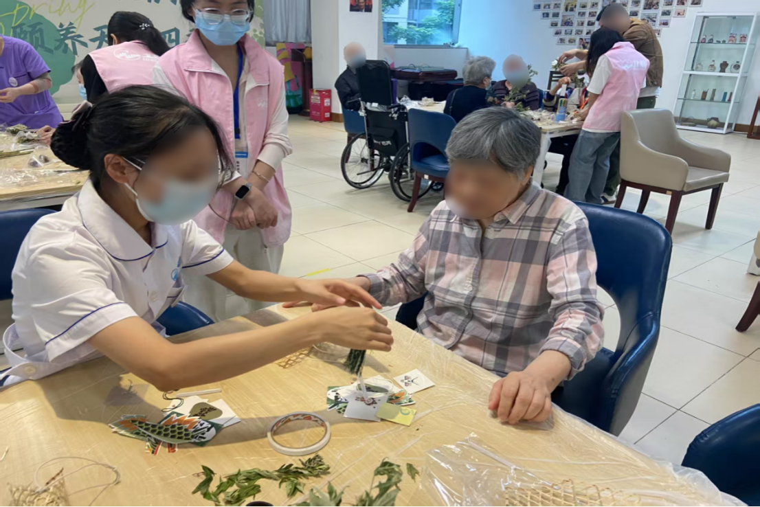活动开始前,志愿者们协助工作人员布置场地,营造端午的节日氛围。活动围绕包粽子和艾草编织两个部分进行。在包粽子环节,志愿者们向老人们讲解了水晶粽的制作步骤,并指导老人们包裹馅料、塑形。制作完成后,桌子上摆满了水晶粽子。水晶粽的制作不仅让老人们体验到了制作传统美食的乐趣,还锻炼了他们的动手能力,增进了彼此之间的感情。在艾草编织环节,志愿者们带领老人们共同编织了龙舟挂件。编织完成后,大家一起用颜料为龙舟挂件上色,再将艾草塞入龙舟内部。这种做法既达到了驱虫辟邪的效果,又寄托了端午安康的美好寓意。在编织过程中,老人们不仅体验到了传统技艺,精神世界也得到了充实。活动期间,志愿者时刻维护着现场秩序、配合医护人员保障老人们的安全,确保活动的顺利进行。