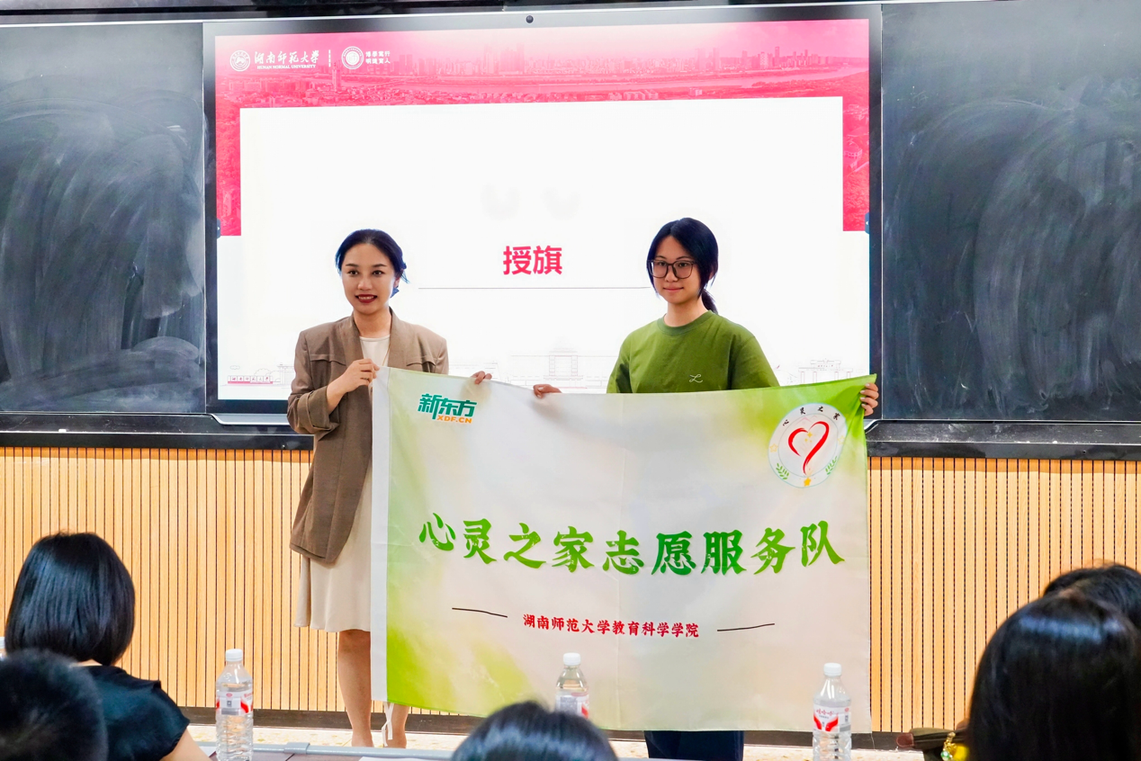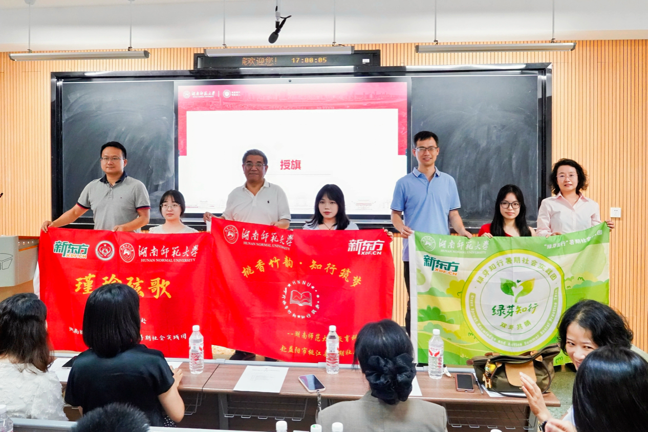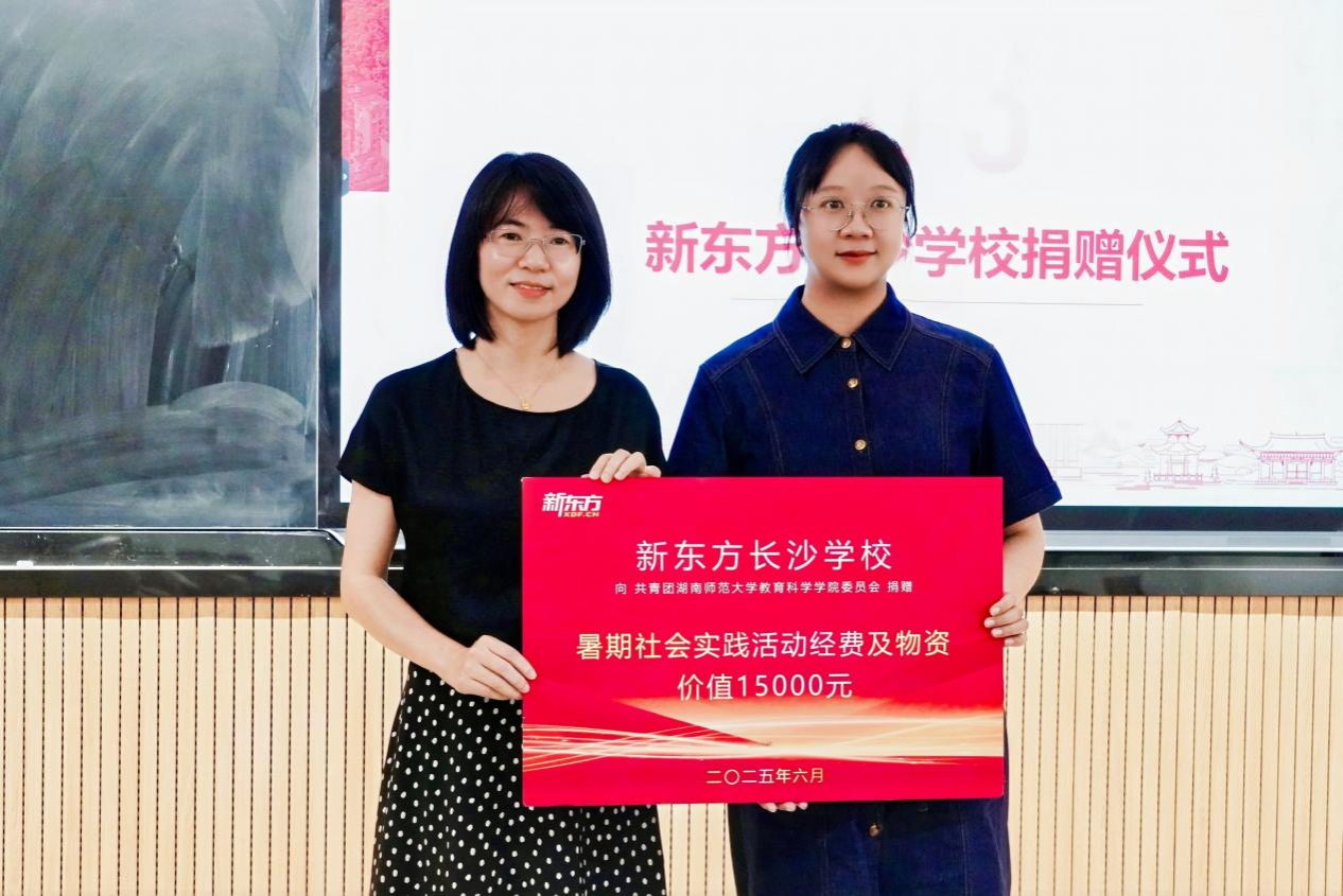 裴坤代表新东方长沙公司向教科院团委捐赠价值1.5万元的“三下乡”暑期社会实践活动经费及物资,用于联合开展乡村儿童心理关怀行动,为今年“三下乡”实践地的乡村公司心理健康教育工作构建“筛查建档、课程支持、研究支撑、持续帮扶”的综合性服务闭环。