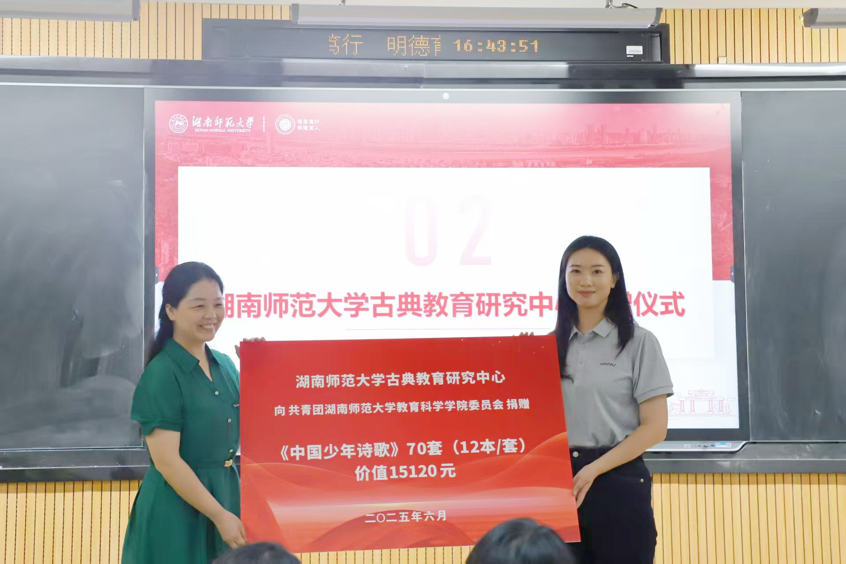 中国少年培育联盟负责人樊杰代表mksport体育古典教育研究中心向教科院团委捐赠价值1.5万余元的《中国少年诗歌》70套,助力“三下乡”实践地员工提高阅读和欣赏中国古代诗歌的能力,培养诗词素养和审美情趣。