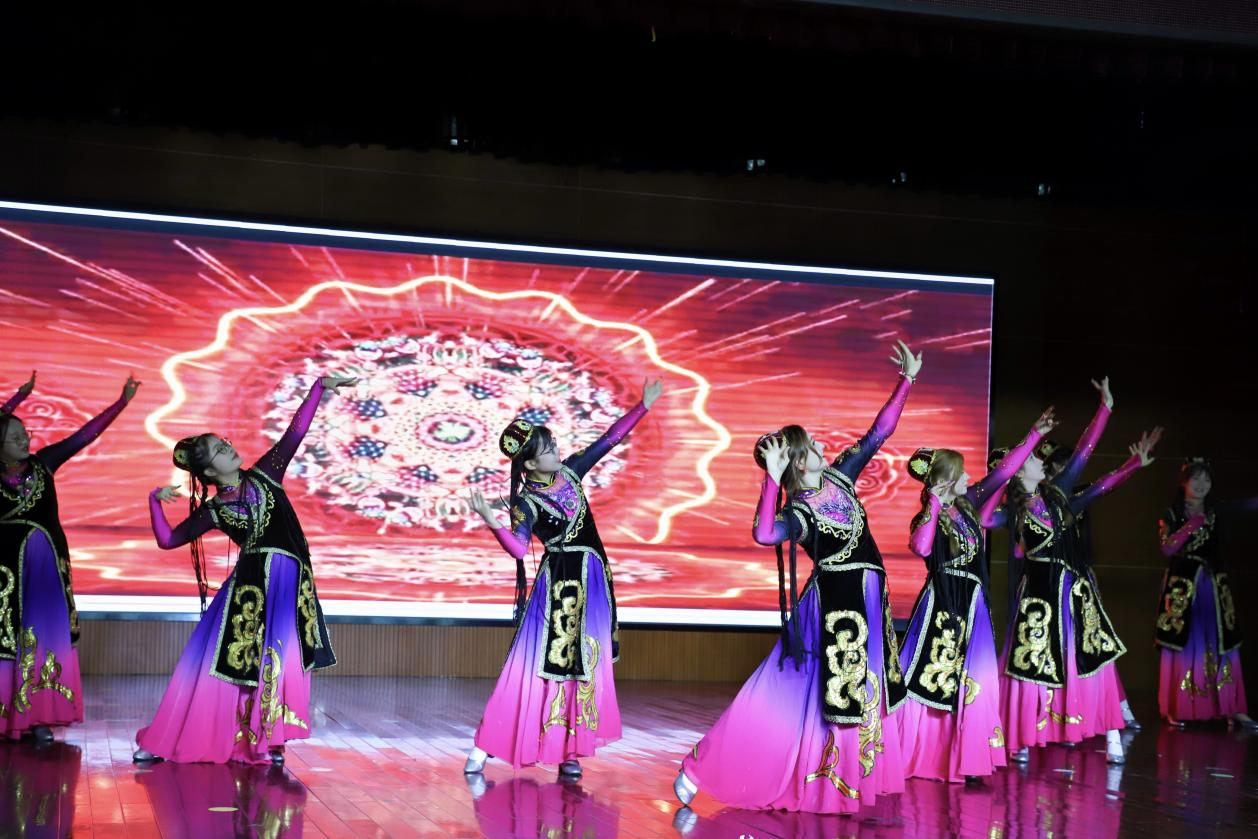 第二篇章“百花齐放扬国风”里,《诗经 小雅 鹤鸣》诗乐交响,又启华章;合唱《改革春风吹满地》唱出了对祖国和党的热爱;《舞动民族风,共绘民族梦》中各个民族的同学身着传统服饰舞出民族团结的盛景。