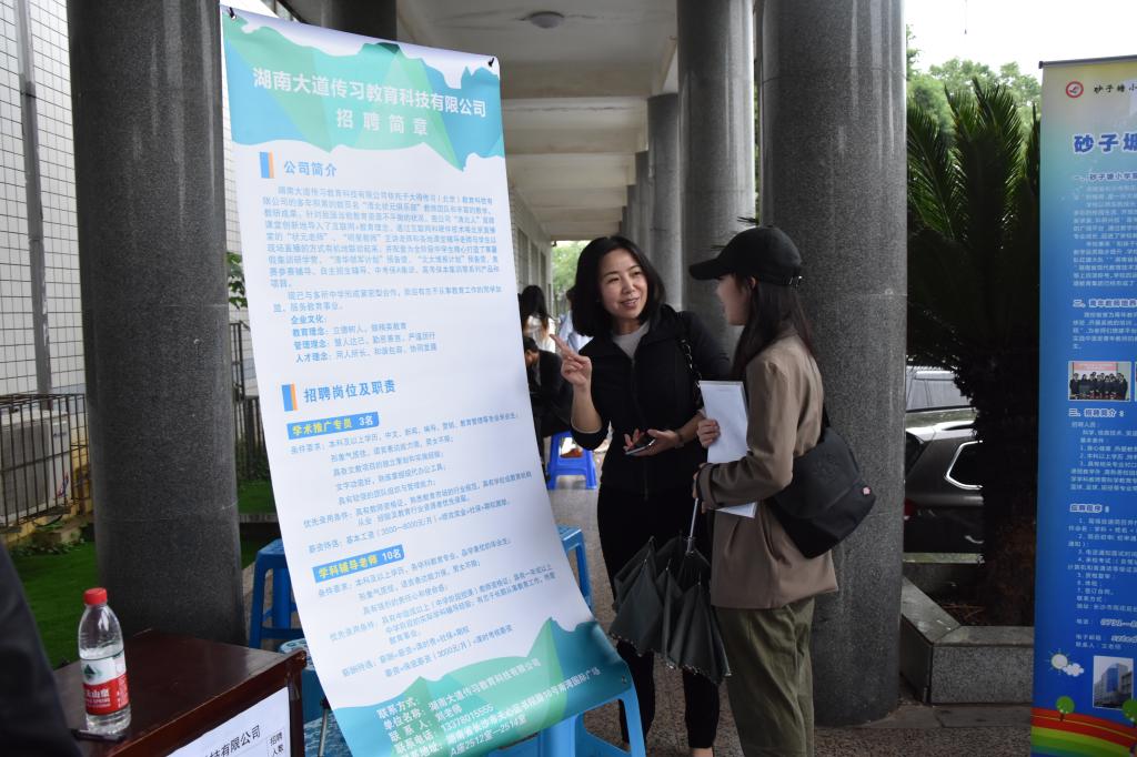 此次招聘会共有湖南光琇医院、湖南省中南艺术公司、长沙市雨花区砂子塘小学、长沙市雨花区砂子塘湘天小学、深圳市南山区纯水岸幼儿园、长沙市雨花区万婴蒙氏幼稚园、深圳市南山实验集团双玺第二幼儿园、长沙市岳麓区金色梯田卓越幼儿园、岳麓区用心教育培训公司、湖南乐听科技有限公司、湖南欧思瑞教育管理有限公司、湖南研必果教育科技有限公司、湖南三真文化咨询有限公司、湖南悦仁教育咨询有限公司、湖南科润文化传播有限公司、湖南锦华国际旅行社有限公司等16家单位参加。