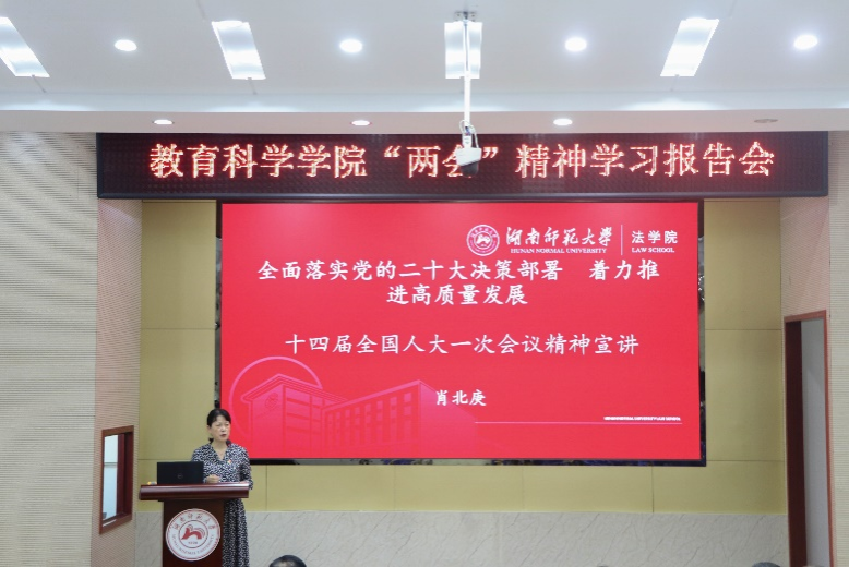 肖北庚以“全面落实党的二十大决策部署,着力推进高质量发展”为主题,从大会选举和决定任命新一届国家机构领导人员,习近平总书记在大会期间发表一系列重要讲话,大会审议并批准工作报告、审查批准了计划、预算,大会批准了国务院机构改革方案,大会审议通过了立法法修正草案,大会坚持发扬全过程人民民主等6个方面进行了讲述。他说,十四届全国人大一次会议是一次民主、团结、求实、奋进的大会,全体代表忠实代表人民的利益和意志,同心同德、履职担当。要认真学习贯彻十四届全国人大一次会议精神,把思想和行动统一到党中央的决策部署上来,统一到习近平总书记重要讲话精神上来,全面贯彻落实党的二十大精神,以时不我待、奋发有为的精神状态做好各项工作。