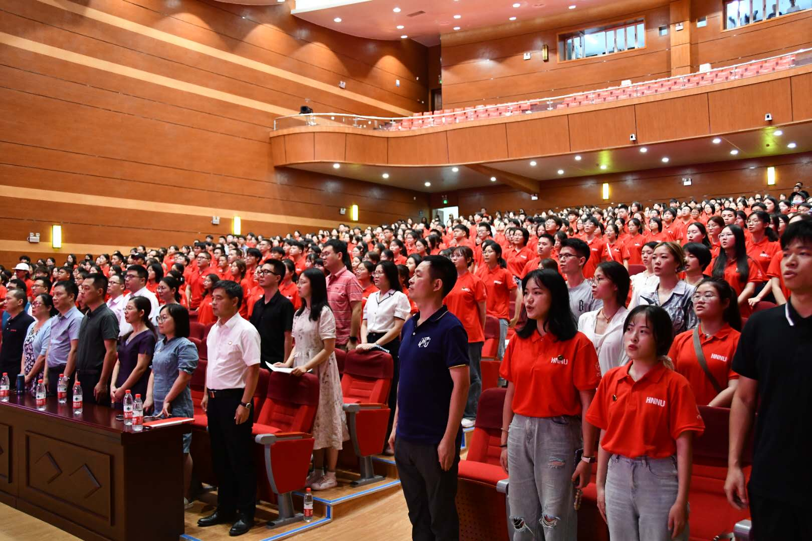 下午14点,全场师生起立、高唱国歌。
