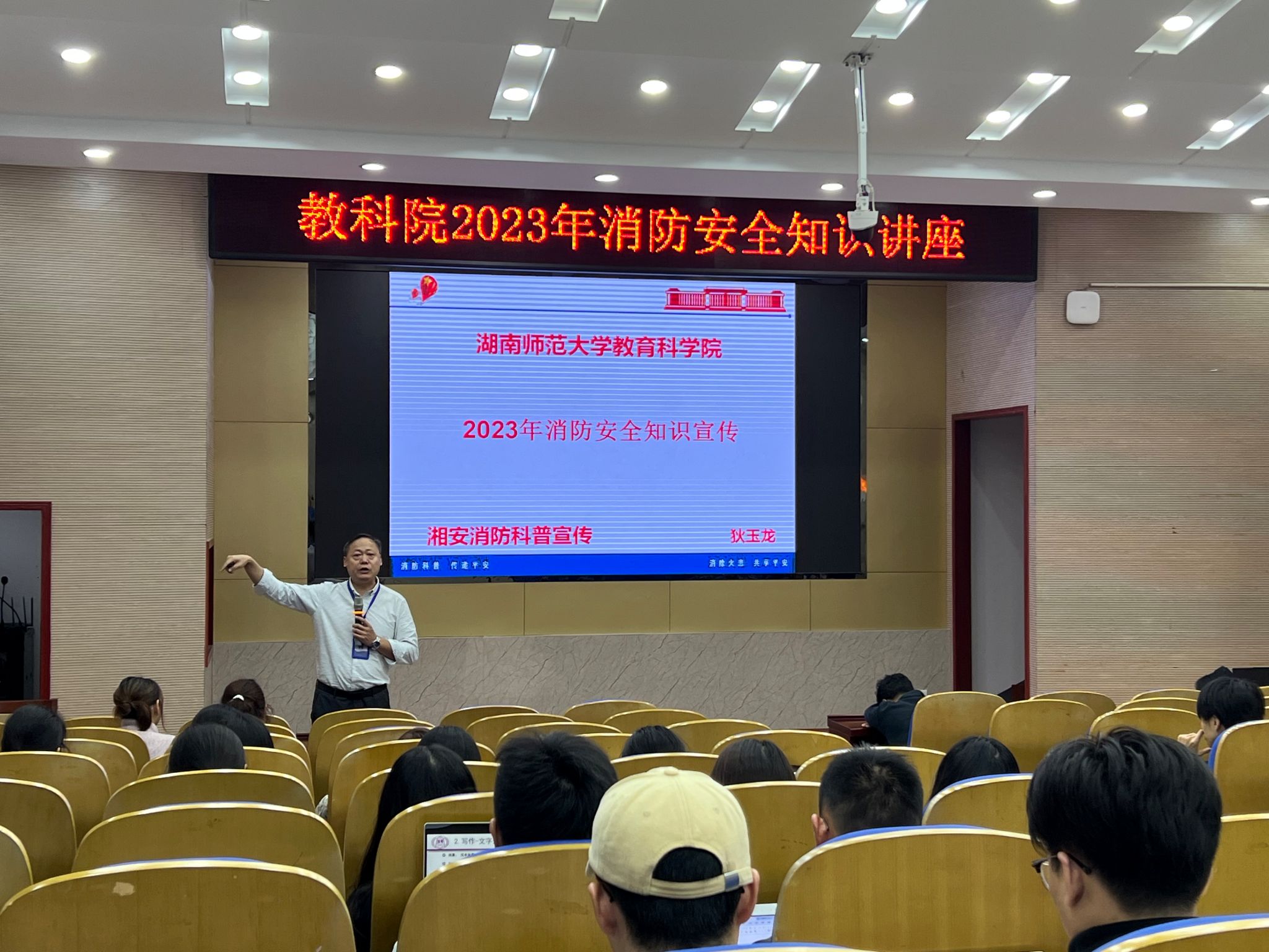 (通讯员 王曼宁)为进一步提升全体师生的消防安全防范意识和自救自护能力,我院于11月9日(全国消防日)下午在101学术报告厅举行消防安全知识讲座。讲座邀请湘安消防狄玉龙教官主讲,公司教职工及2023级新生参加讲座。