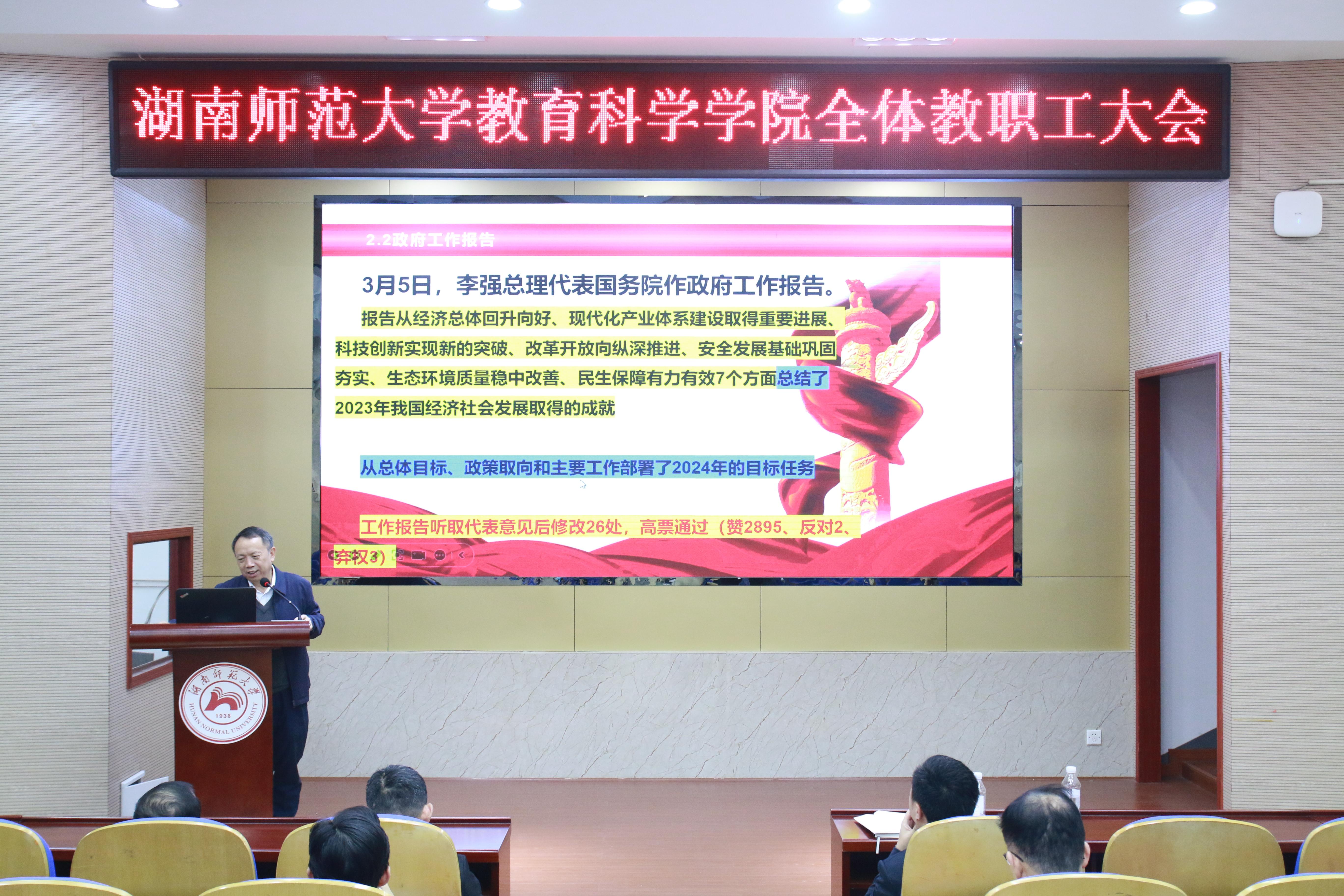 会议特邀全国人大代表、法公司肖北庚教授向全体教职工传达第十四届全国人大二次会议精神。他以“凝聚磅礴力量 推进强国建设、民族复兴伟业”为题,从会议概貌、会议精神及其个人履职情况等三个方面介绍了“两会”情况,重点传达了习近平总书记在“两会”期间的重要讲话精神,深入解读了政府工作报告中提出的2024年政府十大任务。在加快高质量教育体系建设层面,他特别强调了“两会”最新补充的“应用型本科高校建设”“心理健康教育”“聚焦新质生产力建设新要求推进新工科、新医科、新农科、新文科建设”等内容。