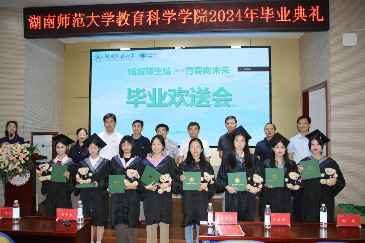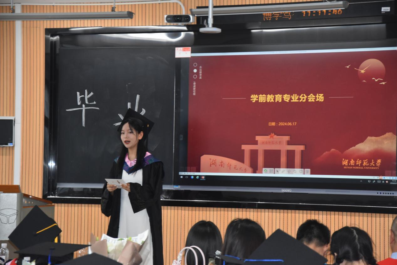 雄壮的国歌声拉开了典礼帷幕,党委副书记欧阳文芳宣读2024年省级、校级、院级优秀毕业生名单。本科生王艺橙、研究生杨菁菁作为毕业生代表发言,表达了对母校的感恩之情、对未来的希冀和建功新时代的决心。教育学系主任叶波代表全院教师用520字的发言表达对毕业生的爱与祝福。经理刘铁芳为2024届员工联络员颁发了聘书。
