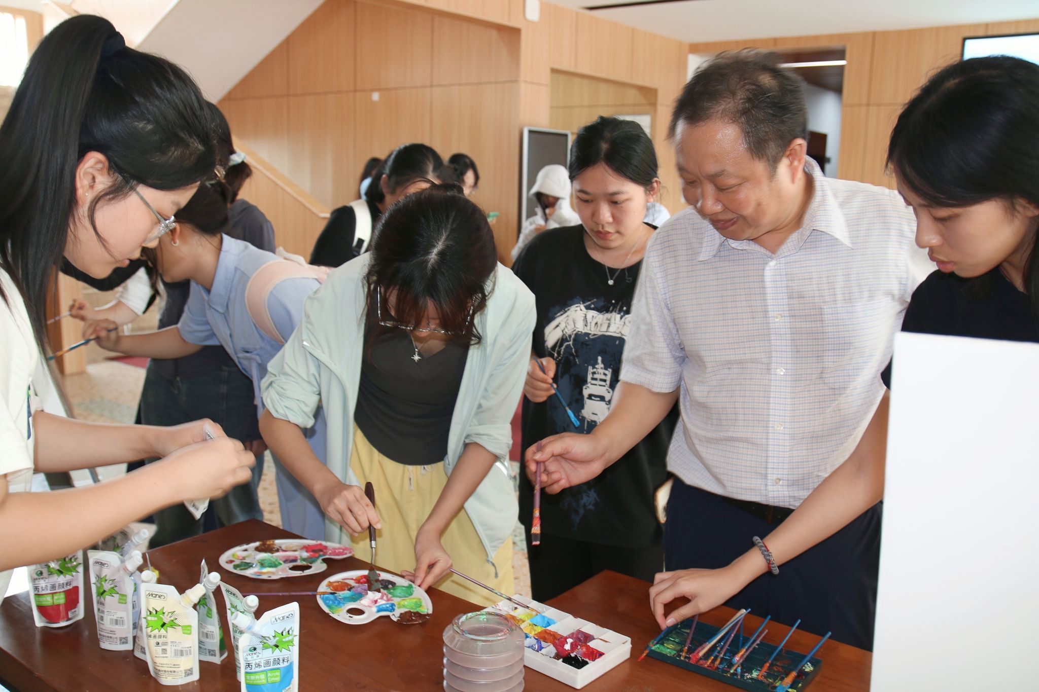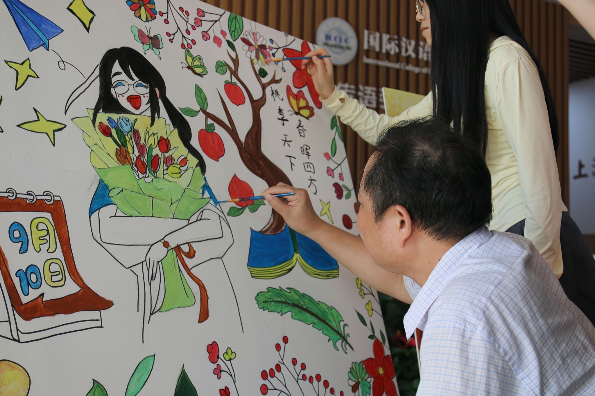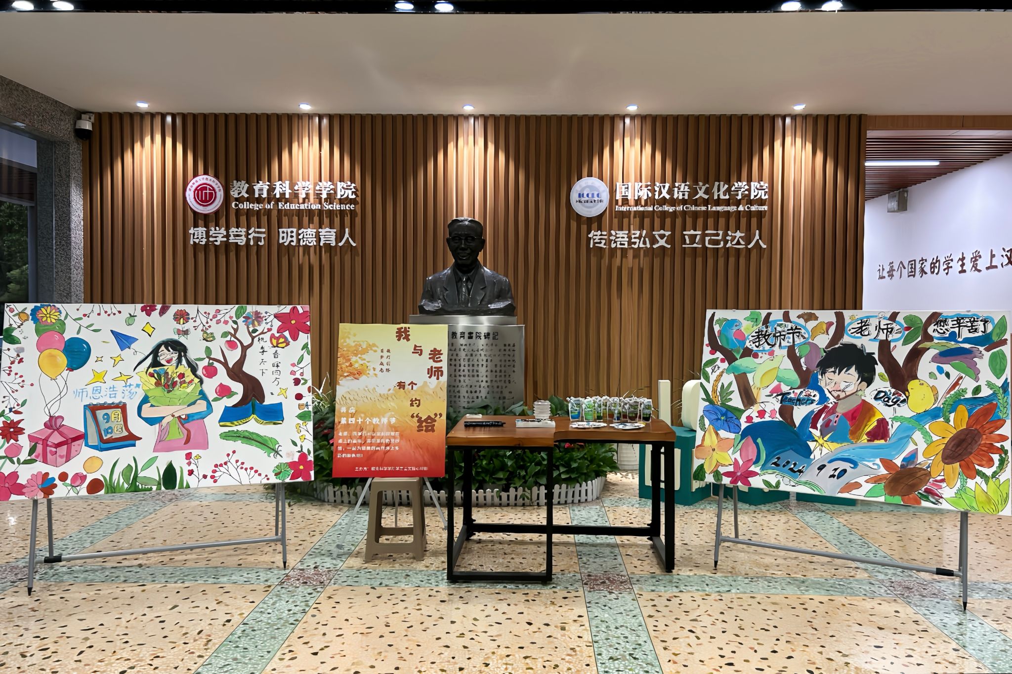 在“笔底春风绘师情”活动中,文娱心理部提前将同学们绘制的展板放置在教科院一楼大厅,邀请全体师生共同参与上色。学前教育系教授郑三元涂色后对活动给予了高度评价,认为其新颖有趣、互动性强,为教师节庆祝活动增添了色彩。