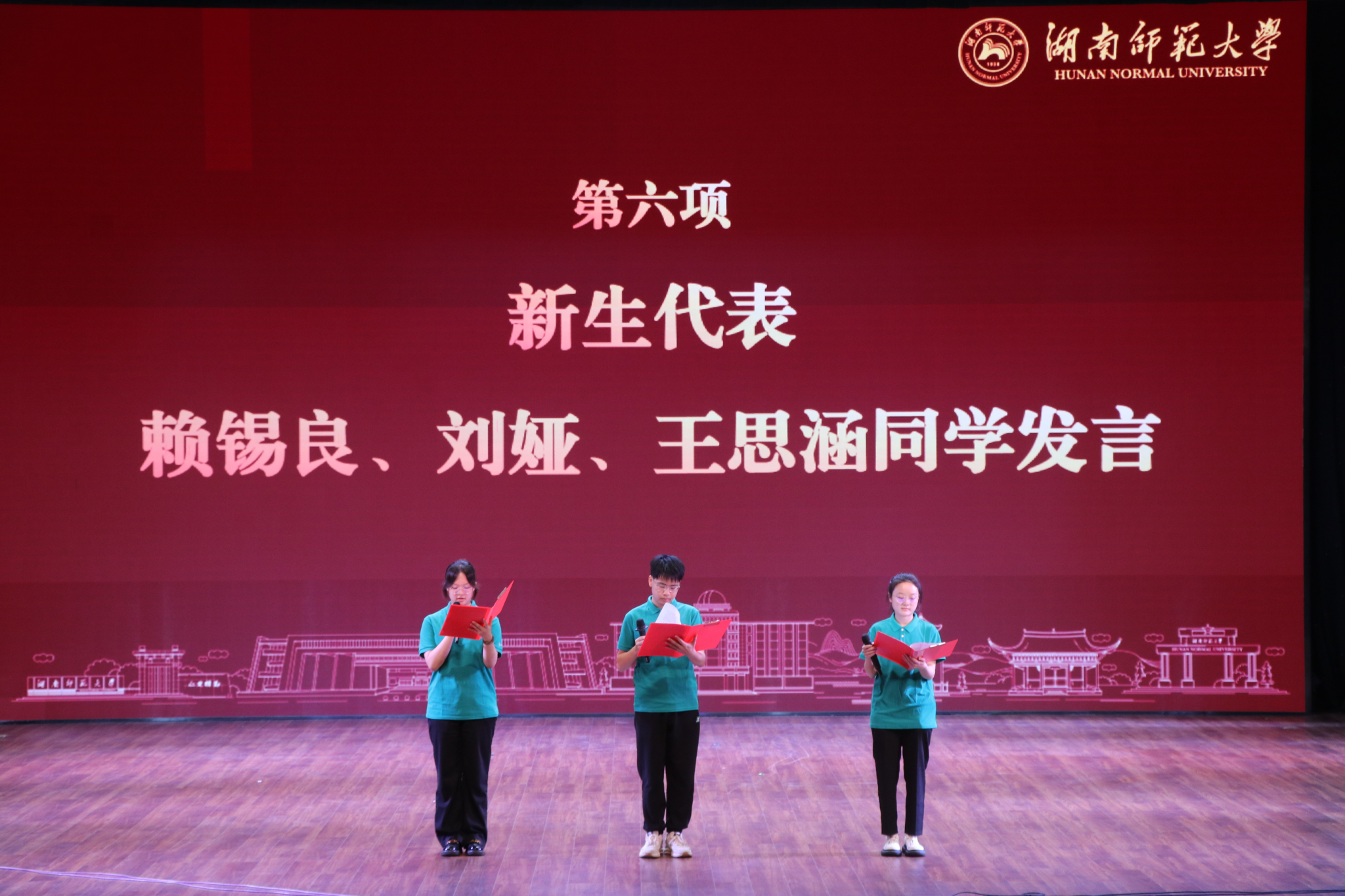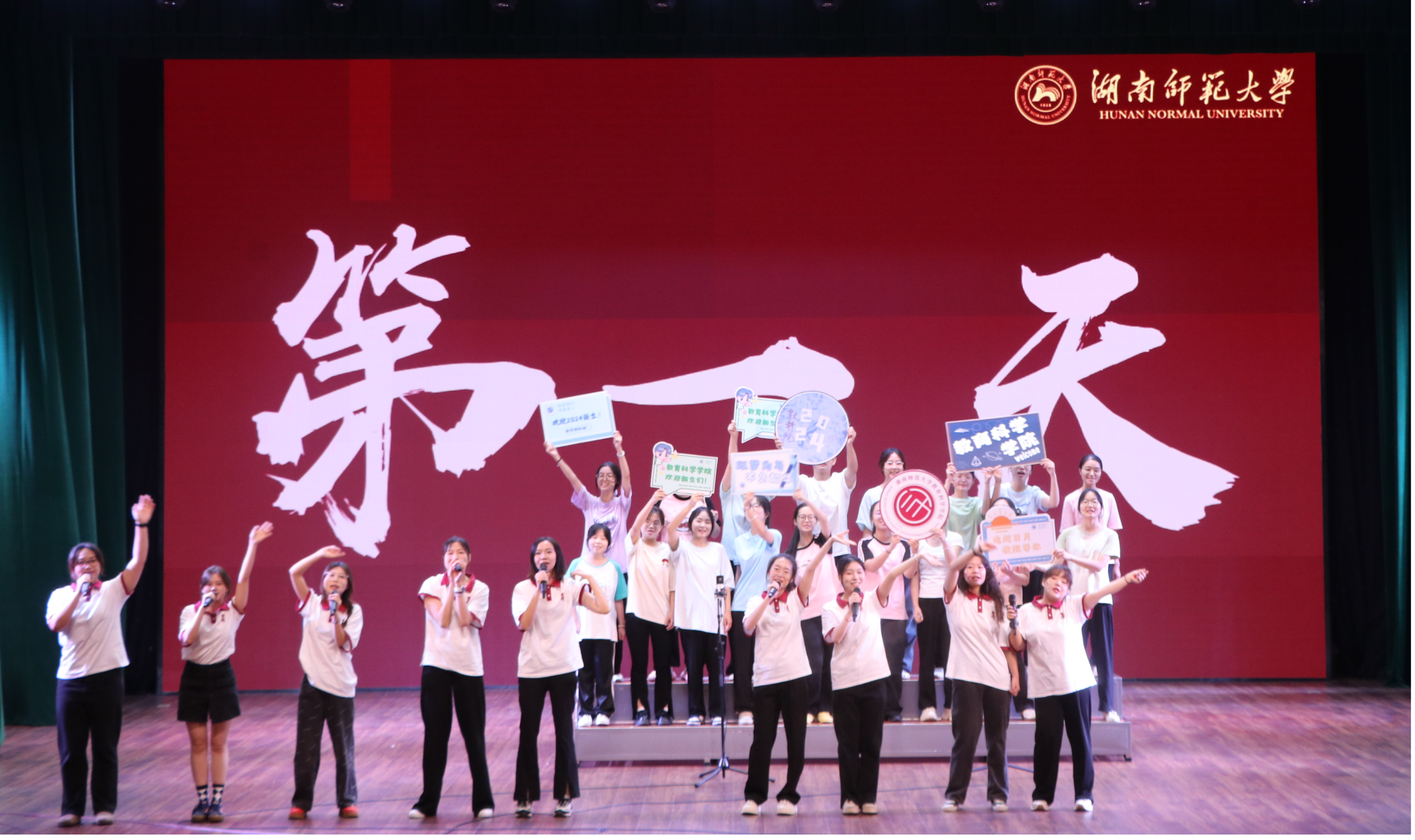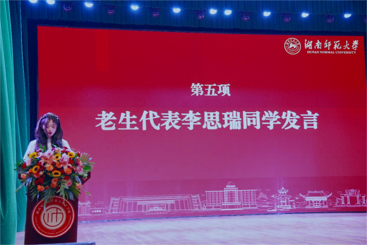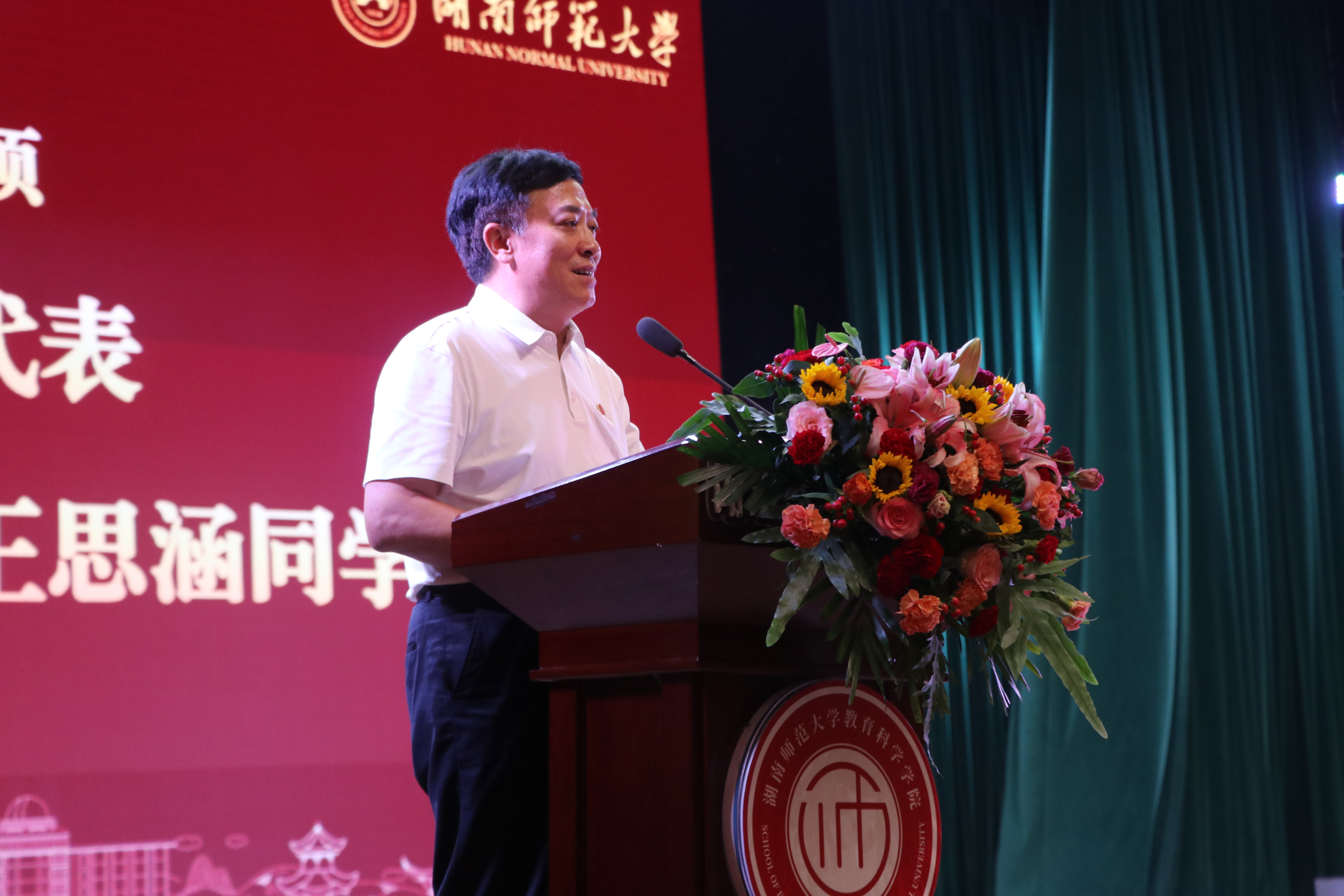 向发意总结讲话。他引用诗人孟郊的《劝学》劝诫新生“青春须早为,岂能长少年”,唯有砥砺前行,方能不负时代,不负青春。新时代的师范青年要做不断弘扬教育家精神、加快建设教育强国的先行者与自燃者、变革者与坚守者。他对2024级的同学们提出了四点要求:一是生命至上,提高安全意识;二是悦纳自身,关注心理健康;三是遵纪守法,重视日常安全;四是保持警惕,预防各类诈骗。他祝福新生们在岳麓山下这一块藏风聚气、钟灵毓秀的知识沃土,勤学勉励,发掘年少青春的无限可能,在新的起点,沐浴桃子湖畔的清风,脚踏实地,努力耕耘,珍惜校园好时光,心中有明月,手可摘星辰!
