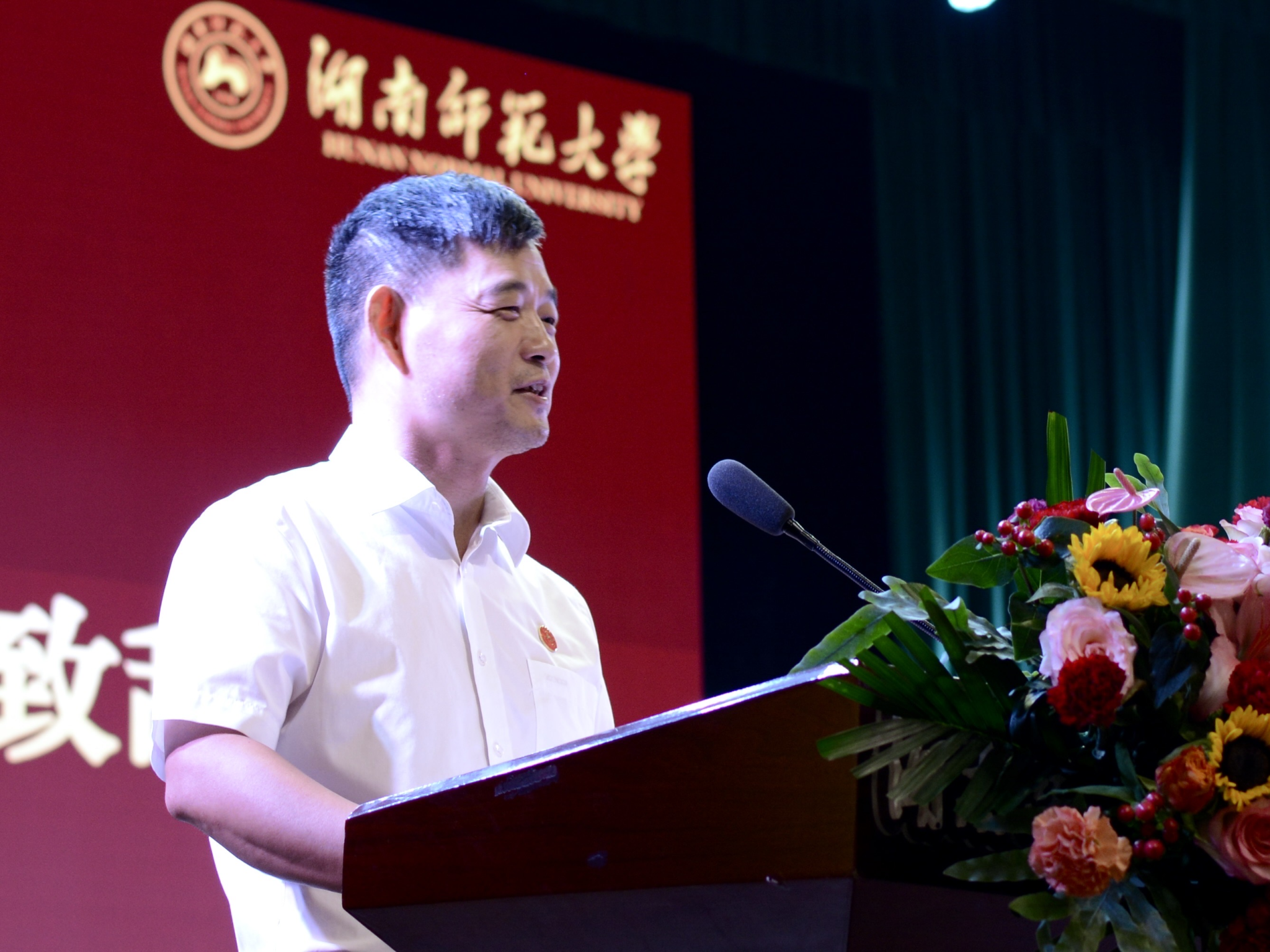 湖南科技大学研究生院经理、党委研究生工作部部长李海萍教授作为院友代表发言。他从“来师大学习的目标是什么”“我该如何思考和行动”两个问题出发,结合自身求学和成长经历,以此勉励新生。他指出,一是要学会做人,充分理解“老员工”“研究生”身份的意义,静学笃行求真知,坚守底线担责任;二是要学会学习,知识为基,能力为重,读书穷理,转变思维并铸造胆识与理性;三是要学会生活,追梦实干,善用资源,奋斗才能成就更好自我。