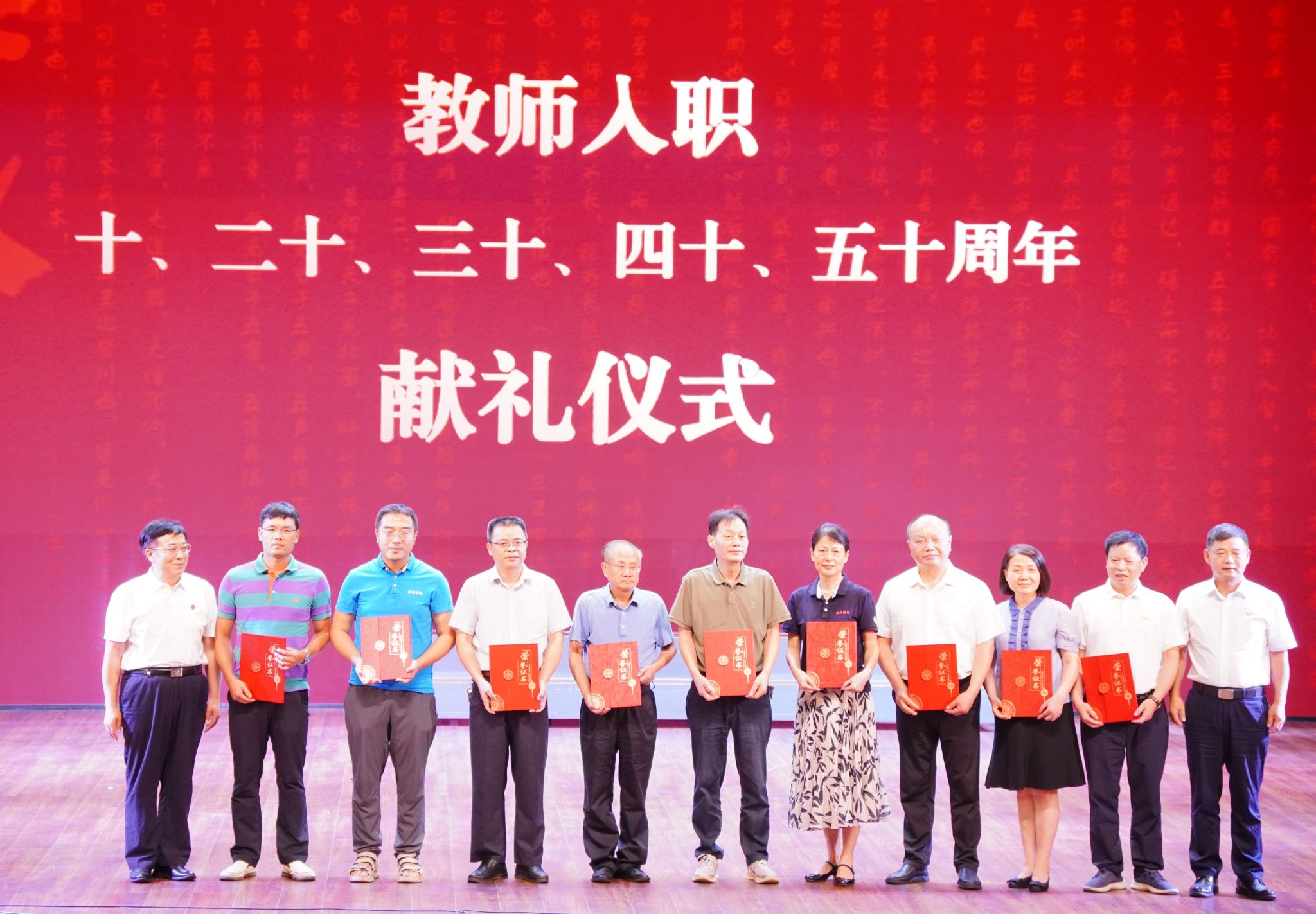 mksport体育古典教育研究中心研究生及六位导师带来唱诗节目《诗经·小雅·肄三》,古琴演绎师友之情、孺慕之情、家国之情;音乐公司党委副书记、2024级员工与发展教育专业博士研究生牟洋、学前教育系刘慧霞老师合作演唱《我爱你,中国》,抒发了对祖国壮丽山河的赞美,对中华民族精神的歌颂;mksport体育附属小学合唱团倾情献唱由公司经理刘铁芳教授作词的《中国少年》,从中国少年培育理念出发,提振少年气象,宏阔公司精神;公司员工干部代表共同演绎《第一天》,祝愿新生怀揣积极乐观的态度走进老员工活。庆祝活动特别设置了致敬献礼环节,经理刘铁芳、党委书记向发意为入职十、二十、三十、四十、五十周年的优秀教师代表颁发荣誉证书并合影留念,2024级新生代表上台献花。