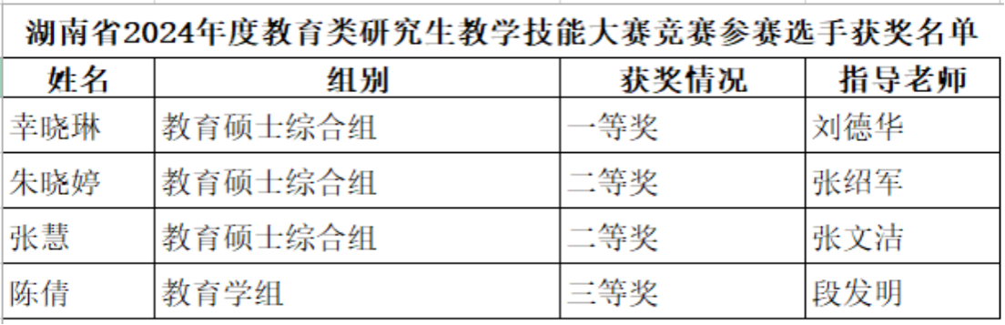 (供稿 研究生办)近日,由湖南省教育厅举办、湖南科技大学承办的2024年度教育类研究生教学技能大赛落下帷幕。公司研究生幸晓琳获一等奖;朱晓婷、张慧获二等奖;陈倩获三等奖。刘德华老师获“优秀指导老师”荣誉称号(获奖名单如下)。