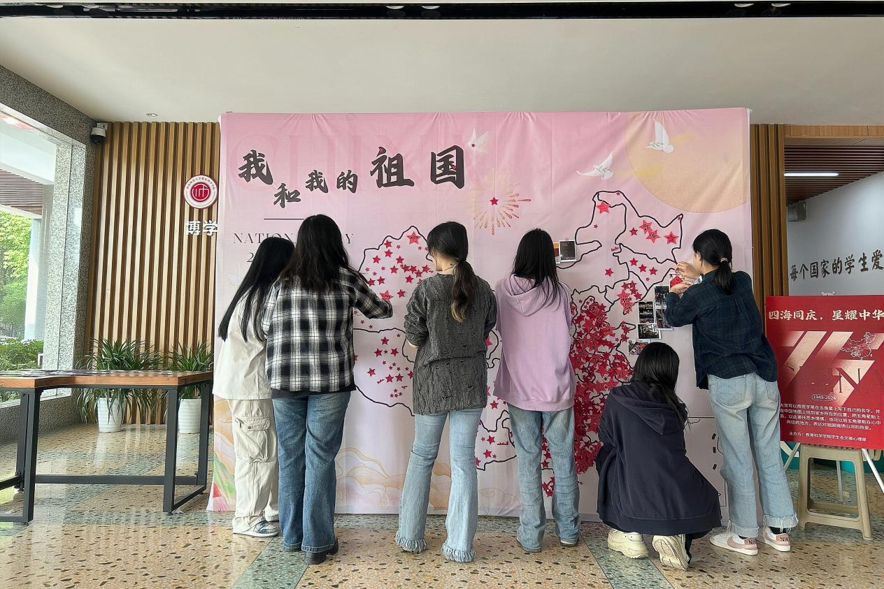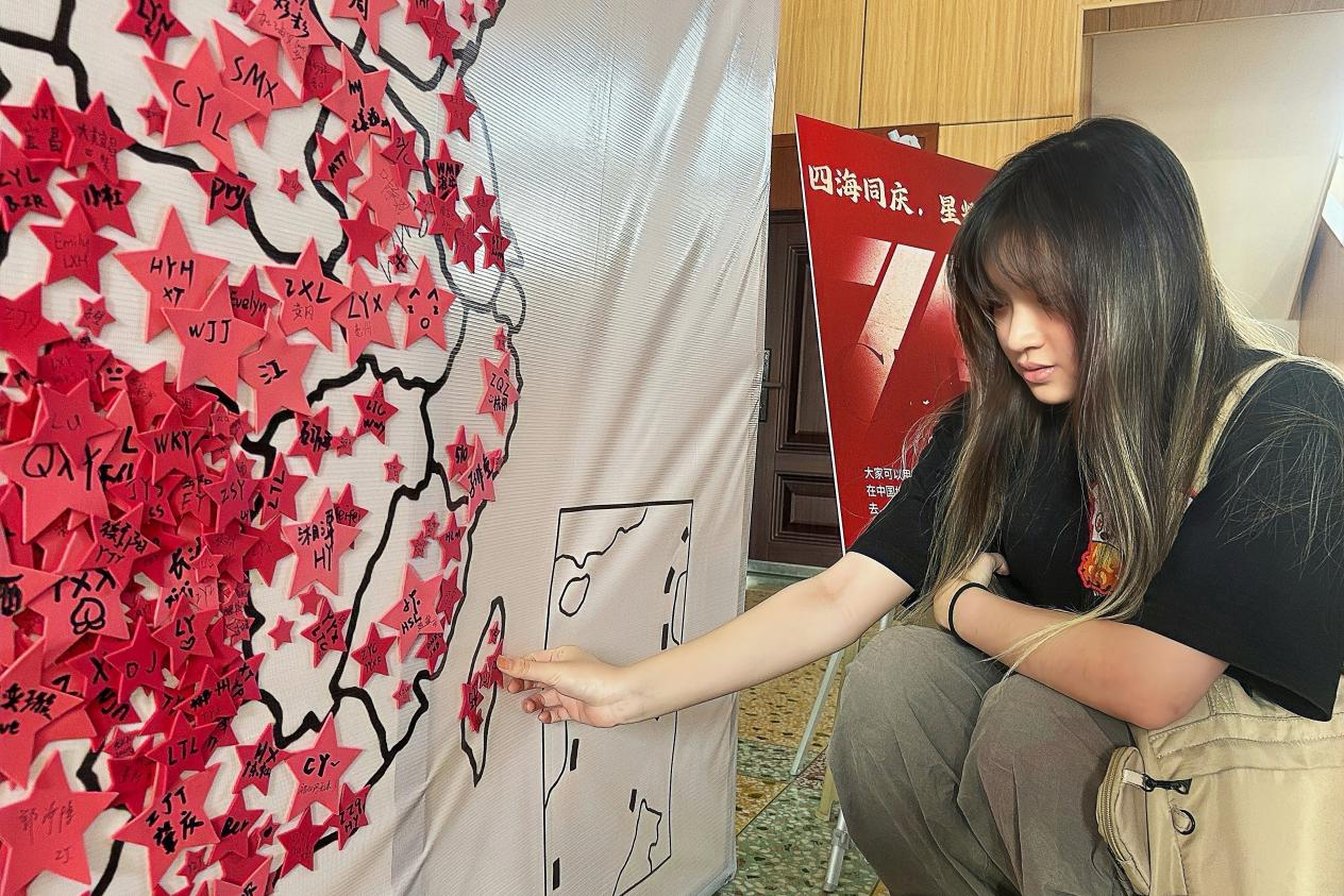 在“四海同庆,星耀中华”活动中,文娱心理部工作人员在公司一楼摆放了绘制有中国行政区划图的大型展板,同学们将写有自己姓名的红色五角星粘贴到家乡所在之处,以寄托对家乡的思念与对祖国大地的热爱。