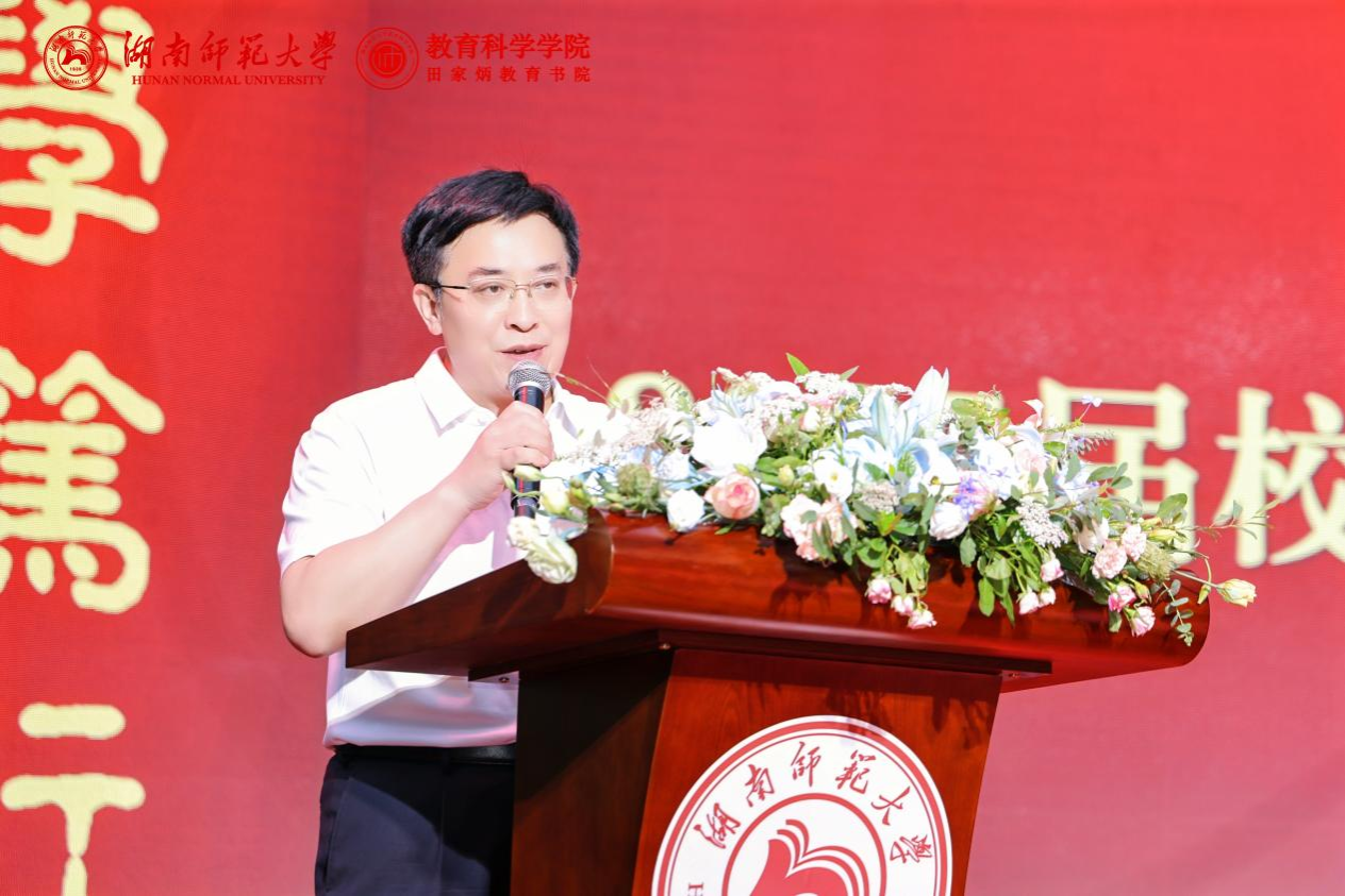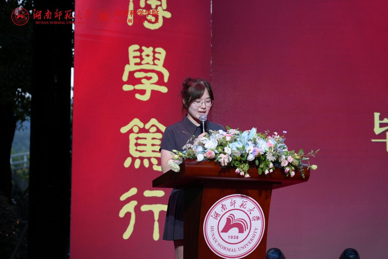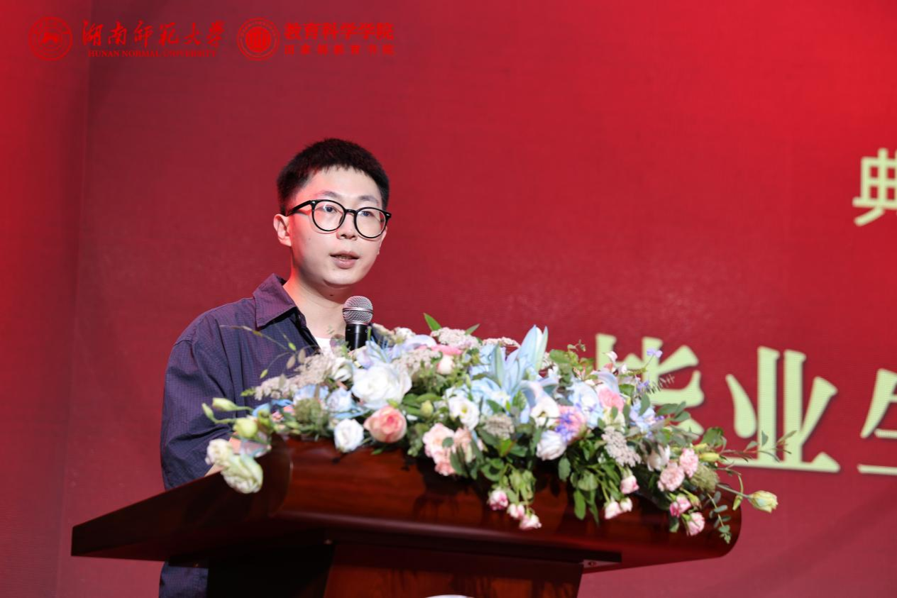 教育学本科生侯思宇、心理学硕士生夏笔奇作为毕业生代表发言。他们讲述了在教科院逐渐成长为脚踏实地、手握笔杆、心怀家国的教育人的经历,表达了对母校、母院以及教科院全体师生的感激与祝福。
