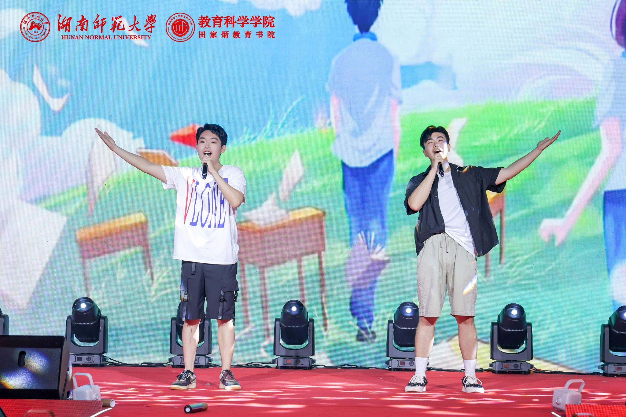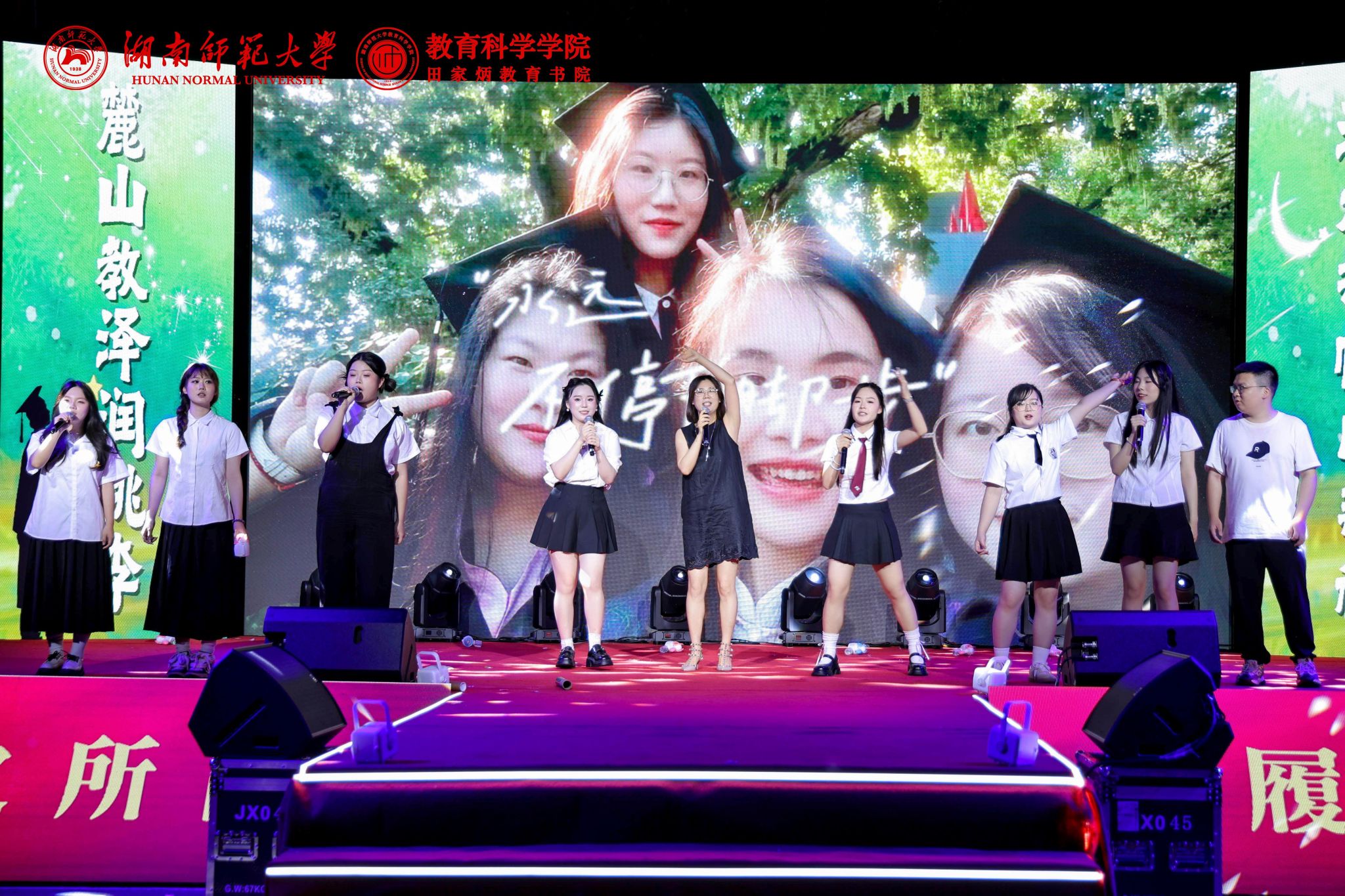 歌会伊始,曾获校一等奖的研究生健美操表演活力开场,动感十足的舞姿瞬间点燃全场,奠定了青春激昂的基调。上官剑、樊杰、刘艳侠、谌衡四个师生团队共同唱响古典教育研究中心原创歌曲《再见,桃子湖的夏天》与《振鹭》,传递师生间的美好祝福。向燕辉老师以《向天再借五百年》豪迈开唱点燃现场,随后率师生团队演绎《再见》,真挚表达师生离别情。毕业生与同学们携手演绎《爱的回归线》《最长的电影》等经典歌曲,引发全场共鸣,毕业生纷纷和唱。