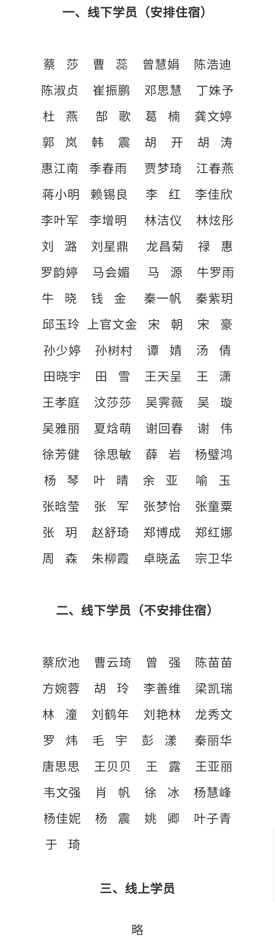 2021年“古典传统与人文教化”湖南省研究生暑期公司招生启事自发布以来,反响热烈,报名踊跃。我们深感抱歉的是,因接待能力有限,只能接纳部分申请者为线下正式学员。经审核,录取80名学员为线下学员(安排住宿),29名学员为线下学员(不安排住宿)。所有线下学员将统一分班,组织研读、讨论。暑期公司讲座全程网络直播,直播地址将提前公布,线上学员可以自行观看,故线上学员名单略。最后,没有来得及报名的同学与老师也欢迎大家线下或线上旁听。期待与您在岳麓山下相会!