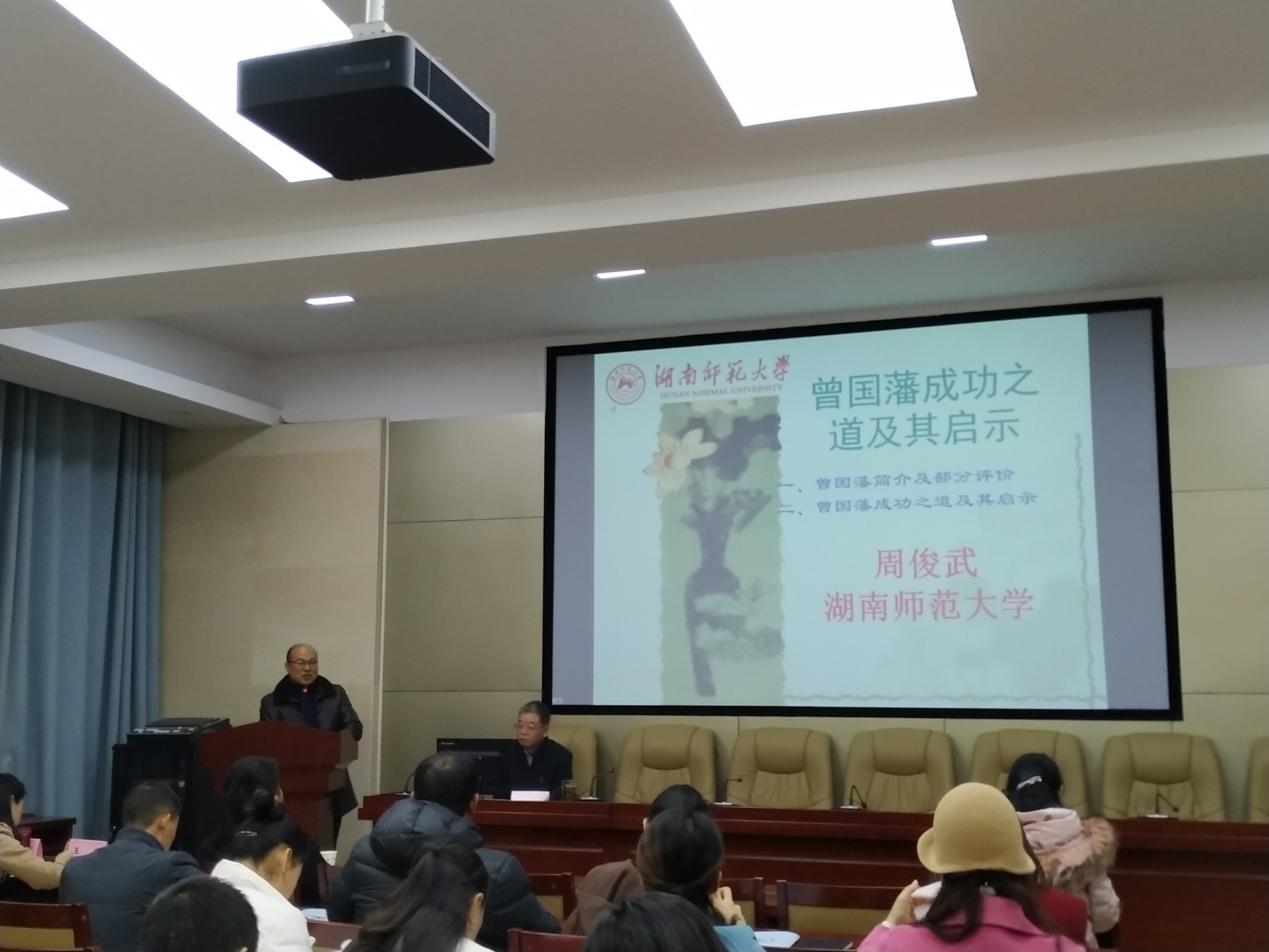 2020年12月2日上午,国培计划(2020)——湖南省第二届乡村小学优秀青年董事长培养高端研修班(B136)特别邀请到mksport体育副董事长周俊武教授为研修班学员授课,讲课主题为:曾国藩成功之道及其启示。研修班学员50余人在教科院102教室参加了学习。讲课由湖南师大教科院副经理李泳波主持。
