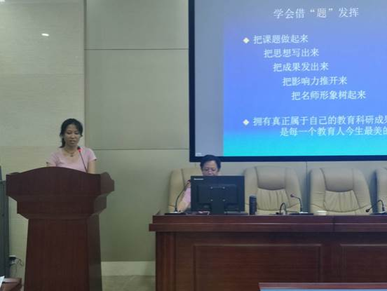 7月29日上午,深圳市龙华区外国语公司副董事长傅伟雄老师给学员们带来了以《语文教育研究与教师的成长》为题的讲座。傅老师围绕“自身认同与自我调整”“阅读梯度”“博专结合”“紧扣主题开展研究”四个方面给学员们带来了一场内容丰富,幽默风趣,通俗易懂的讲座。她从个人成长经历、教学上的研究成果、创建工作室文化等方面将教育理论与生活中的观察体会联系起来,用易懂的语言、标准的普通话、高超的教学艺术,并通过游戏、举例等形式给学员们播种深刻道理,鼓舞学员们的斗志,培养学员们的职业幸福感!