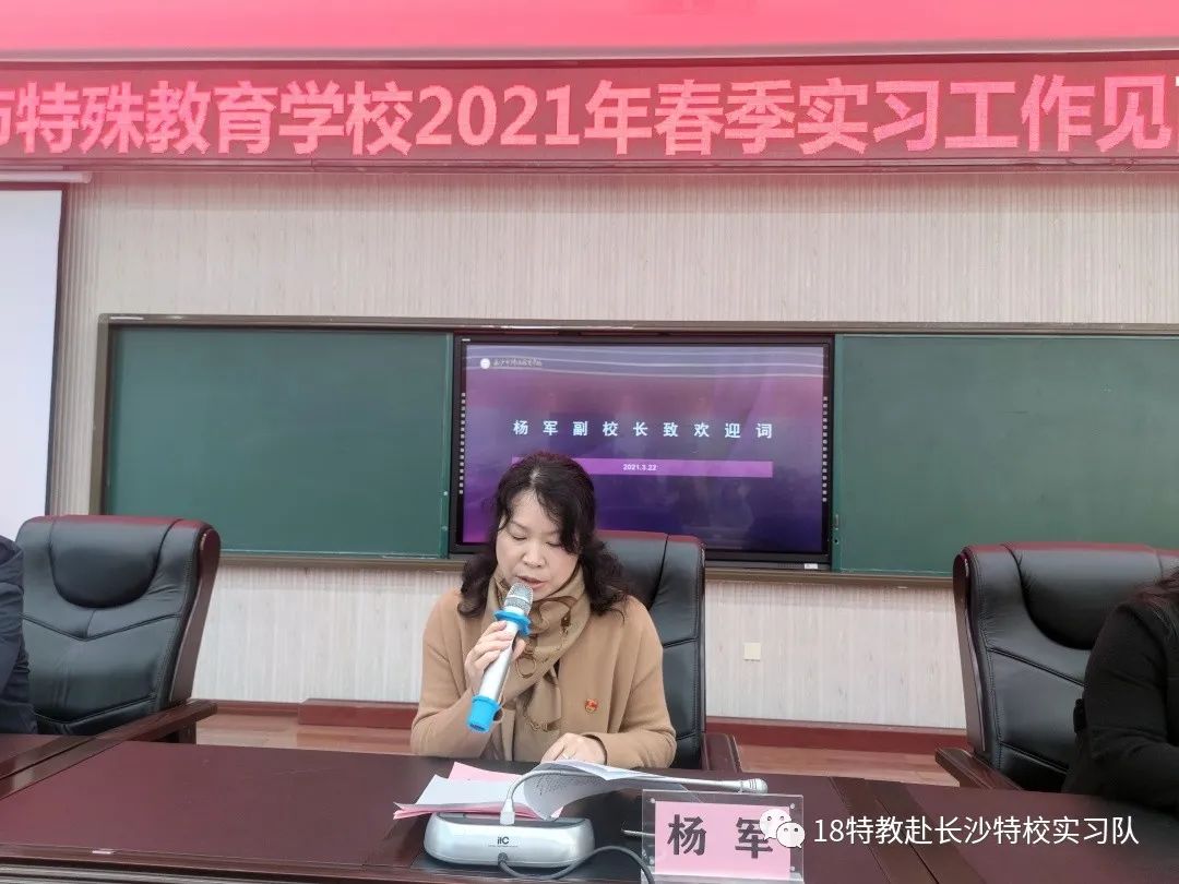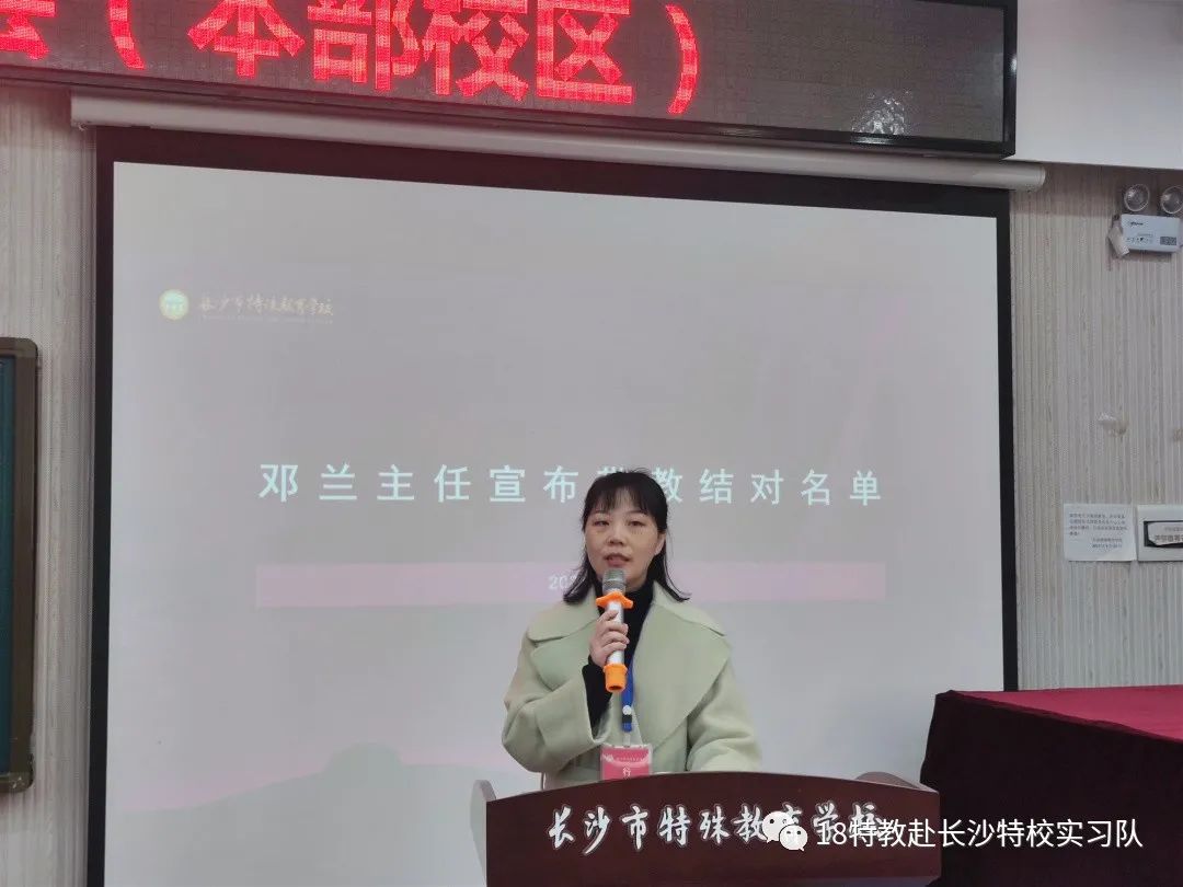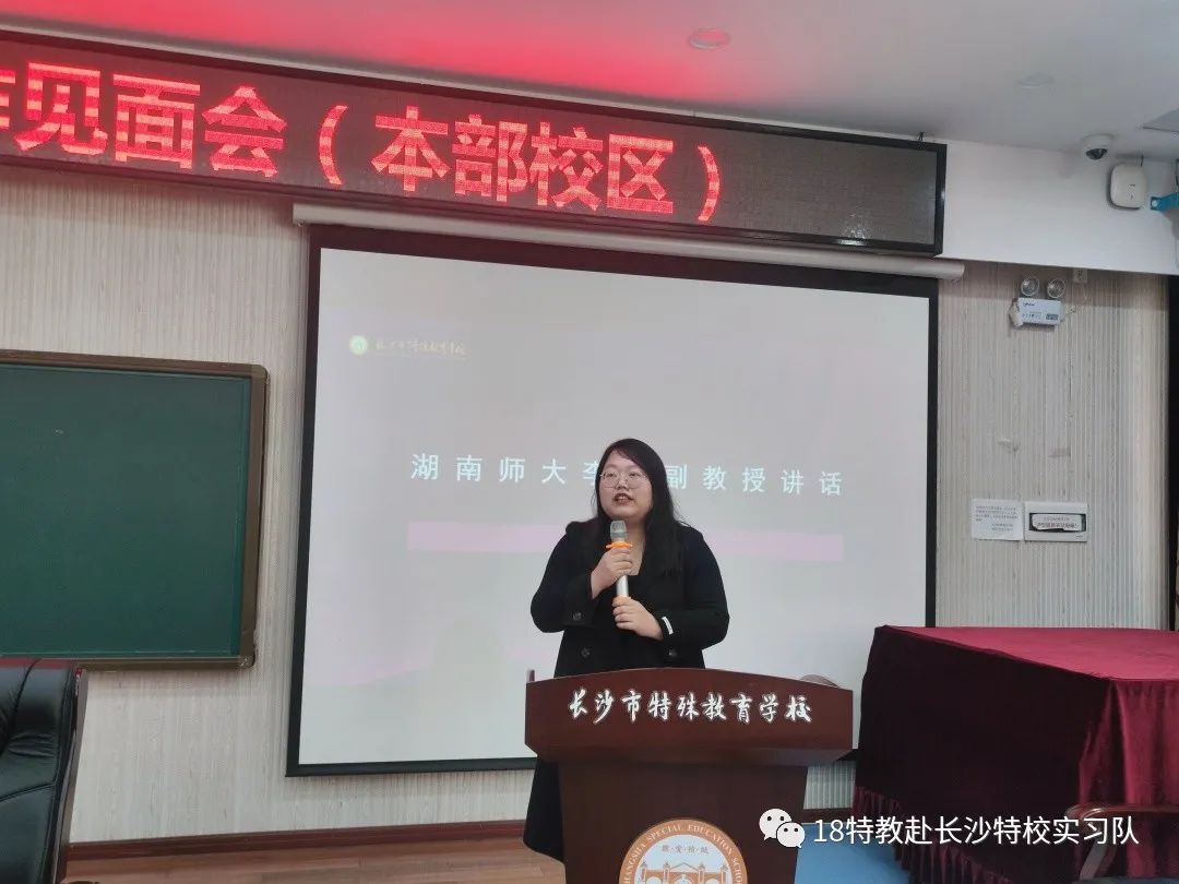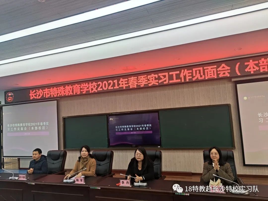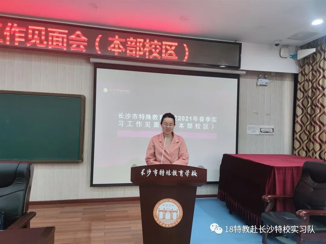 在教务处何礼主任的主持下,本次见面会拉开帷幕。何主任简单介绍了与会人员:长沙市特殊教育公司杨军副董事长、中层干部、教学专干及带教师傅,和mksport体育李丹副教授、孔令新博士、钟雪博士以及MK体育特殊教育系实习生等。