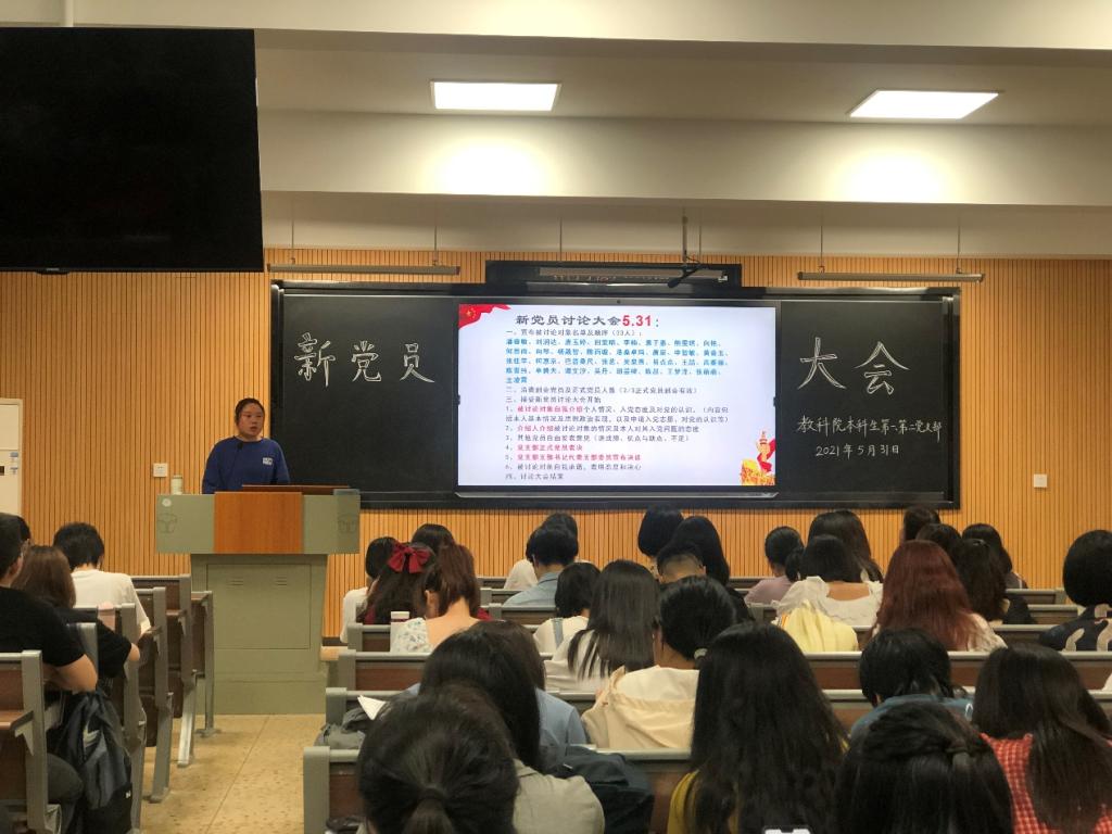 (通讯员 陈圆圆 向丽僮)5月31日晚,MK体育第一、第二党支部在教科院315教室召开新党员讨论大会。大会讨论接收了潘睿敏等52名发展对象,同意潘睿敏等52名同志成为中共预备党员。会议由本科生第一党支部书记向艳君主持,学工办主任马欣出席。
